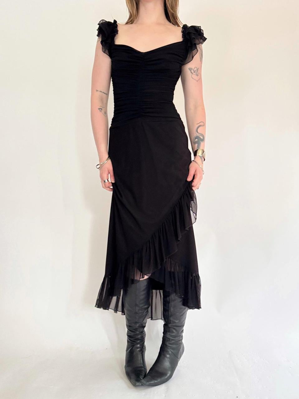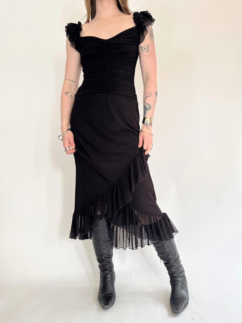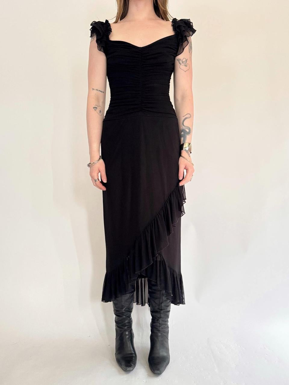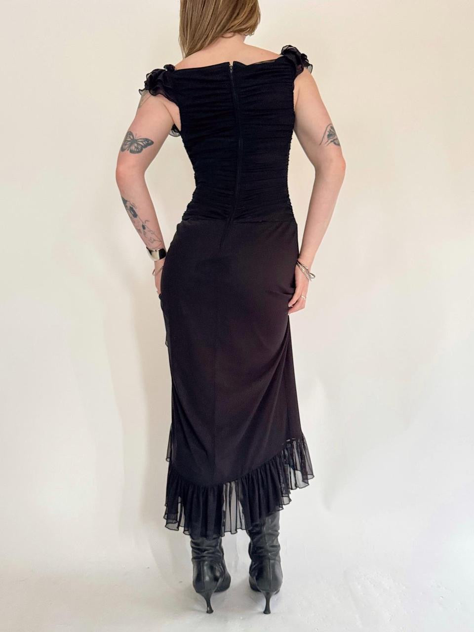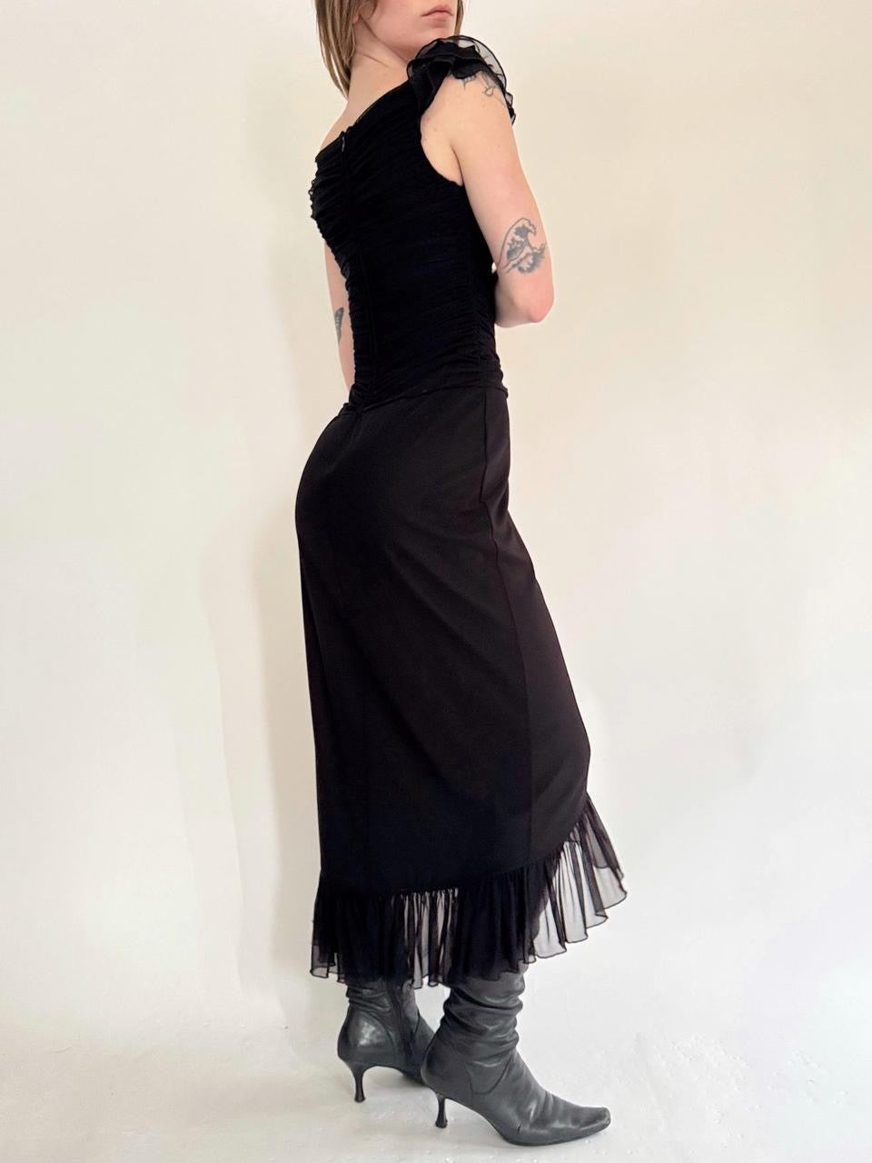 vintage “tadashi” black mesh layered short sleeve maxi dress; tiered ruffled double layered details. ruching in the bust.