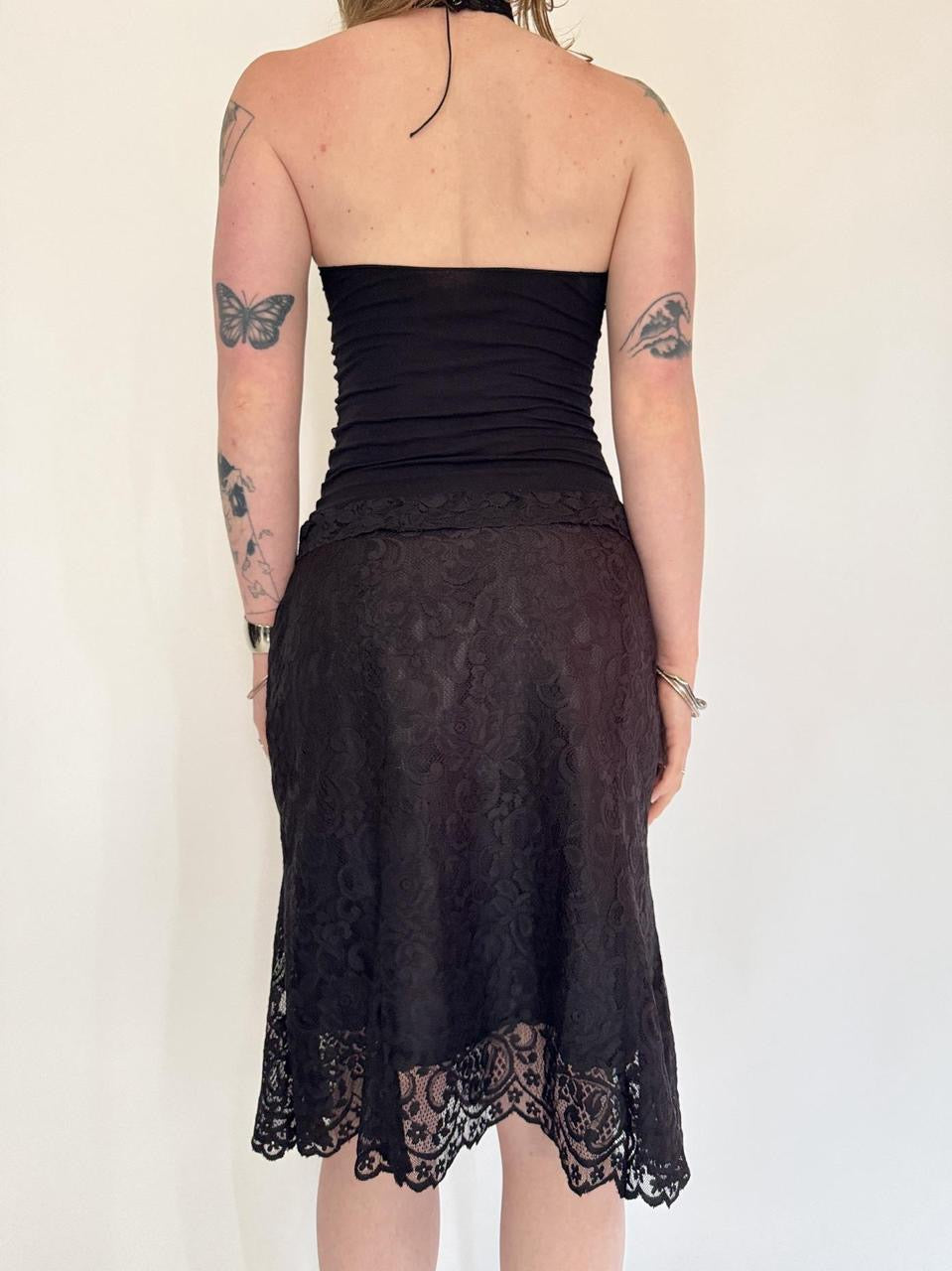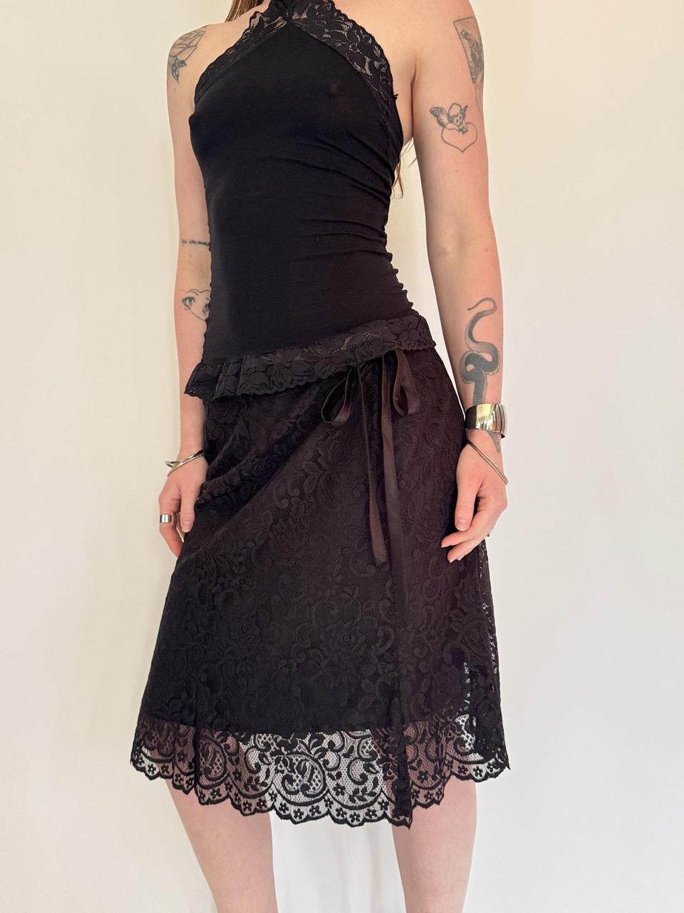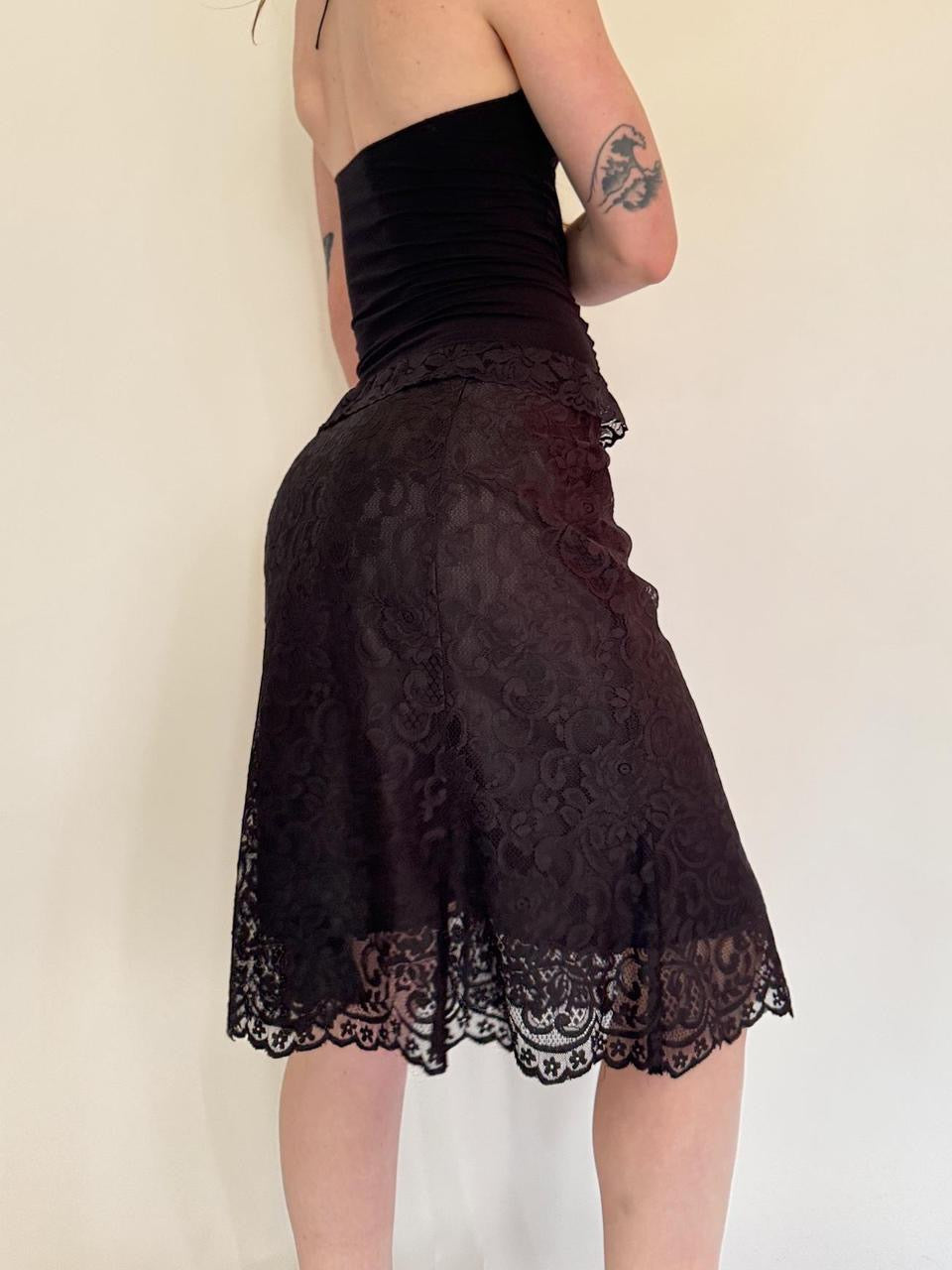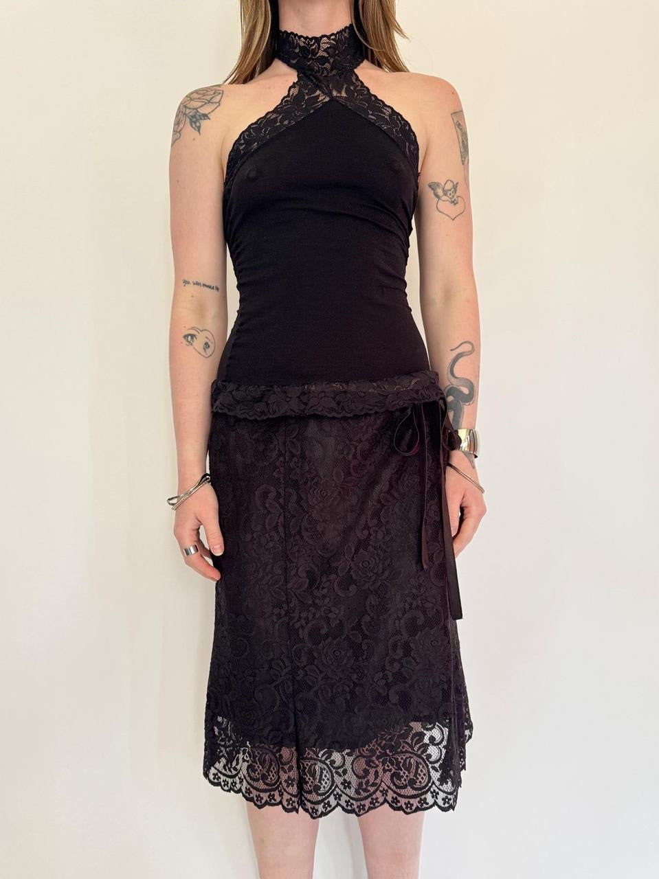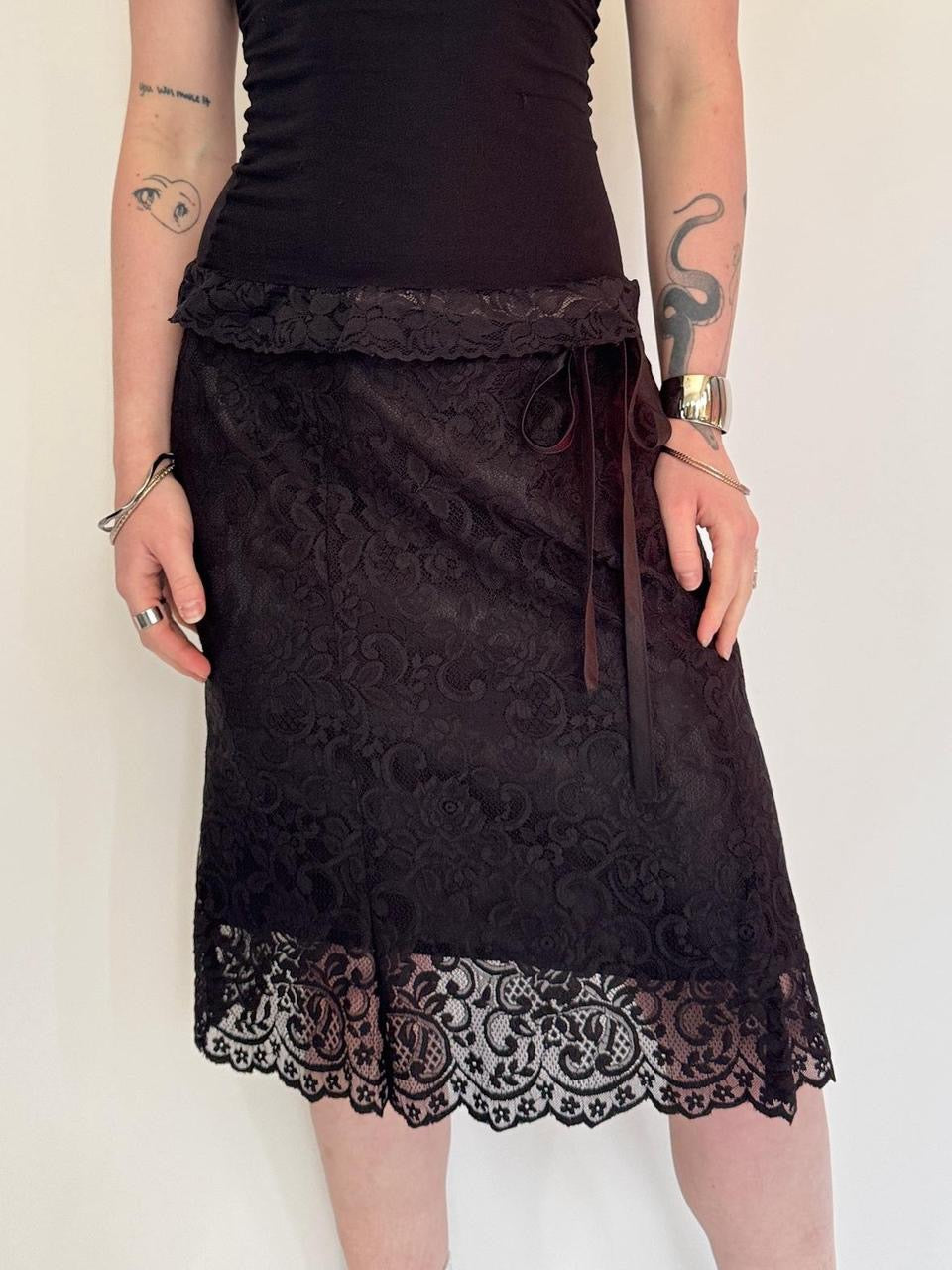 vintage “apostrophe” black lace midi skirt with satin ribbon tie waist detail.