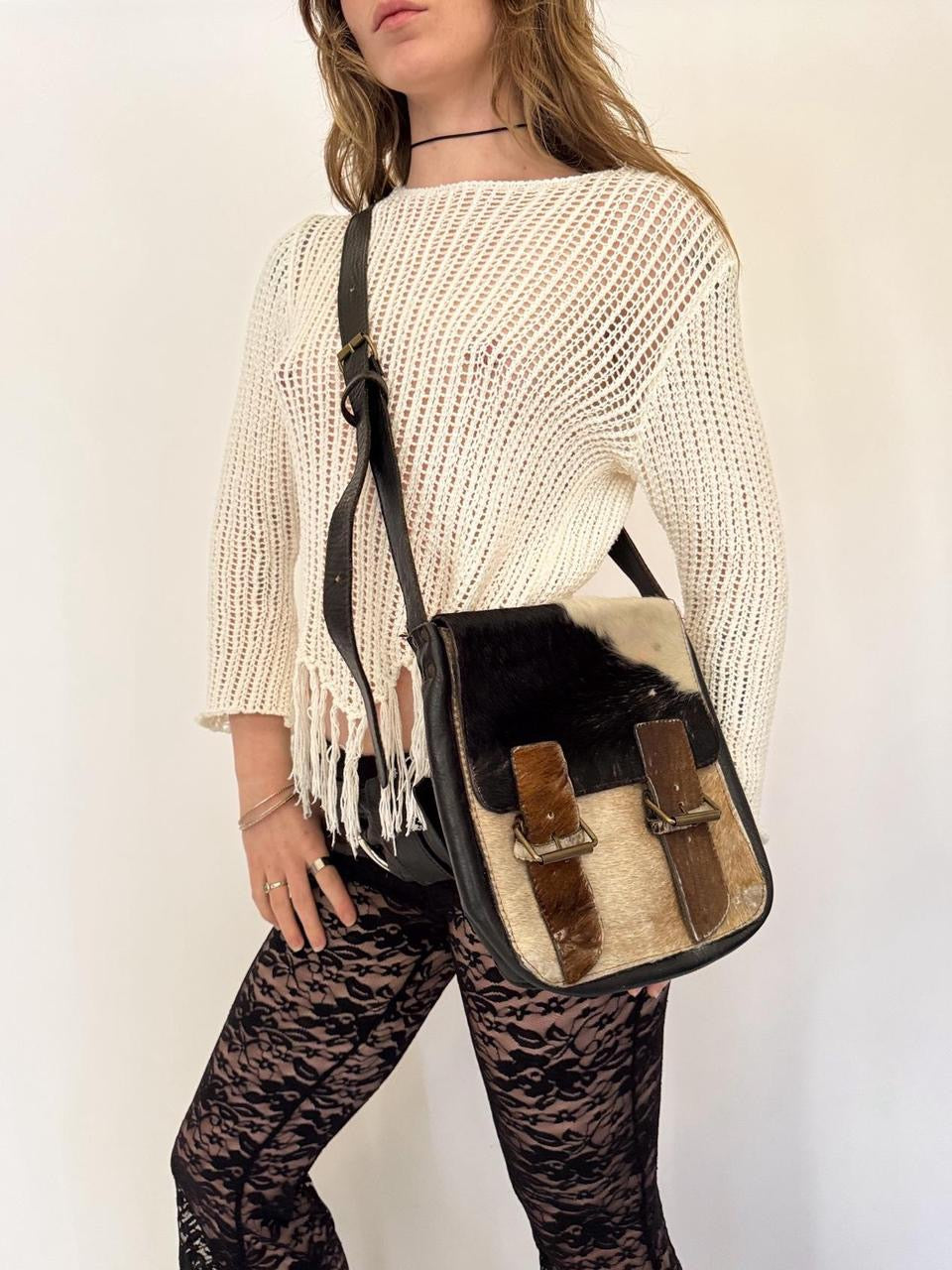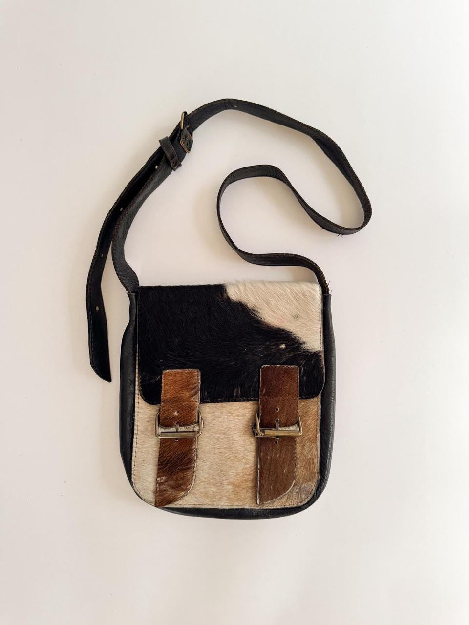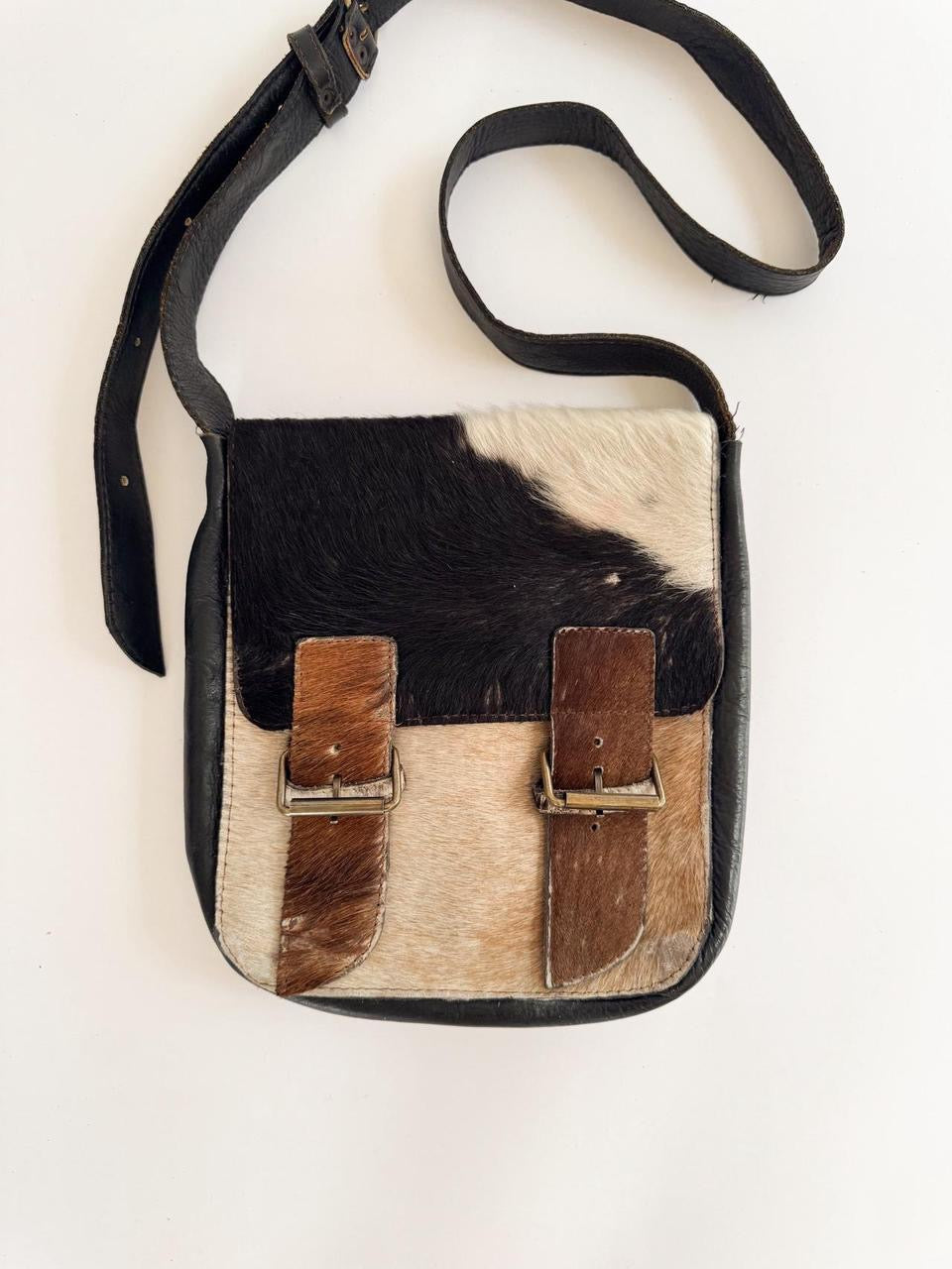 vintage 90s black leather & brown and cream calf hair crossbody bag with buckle details.