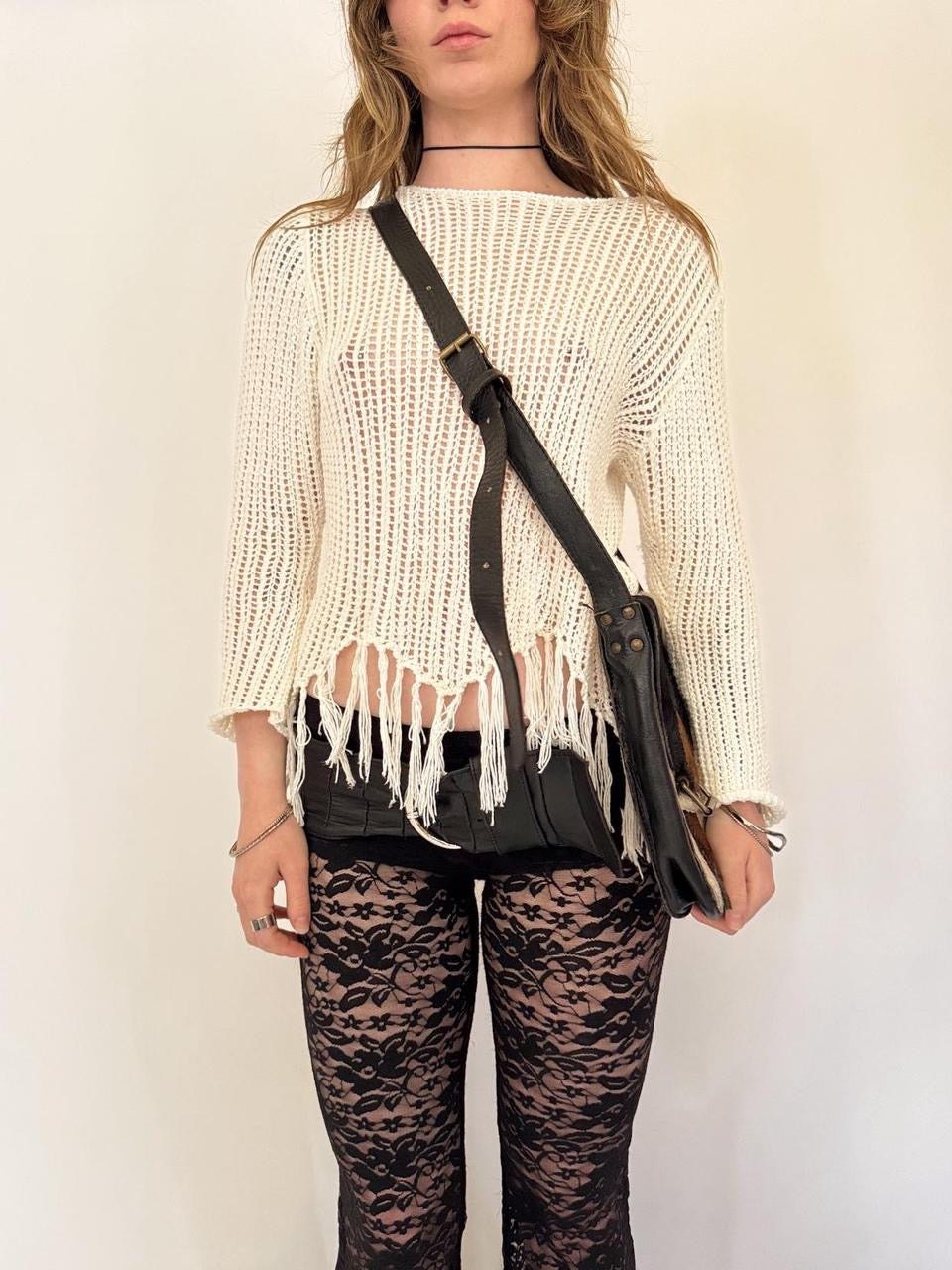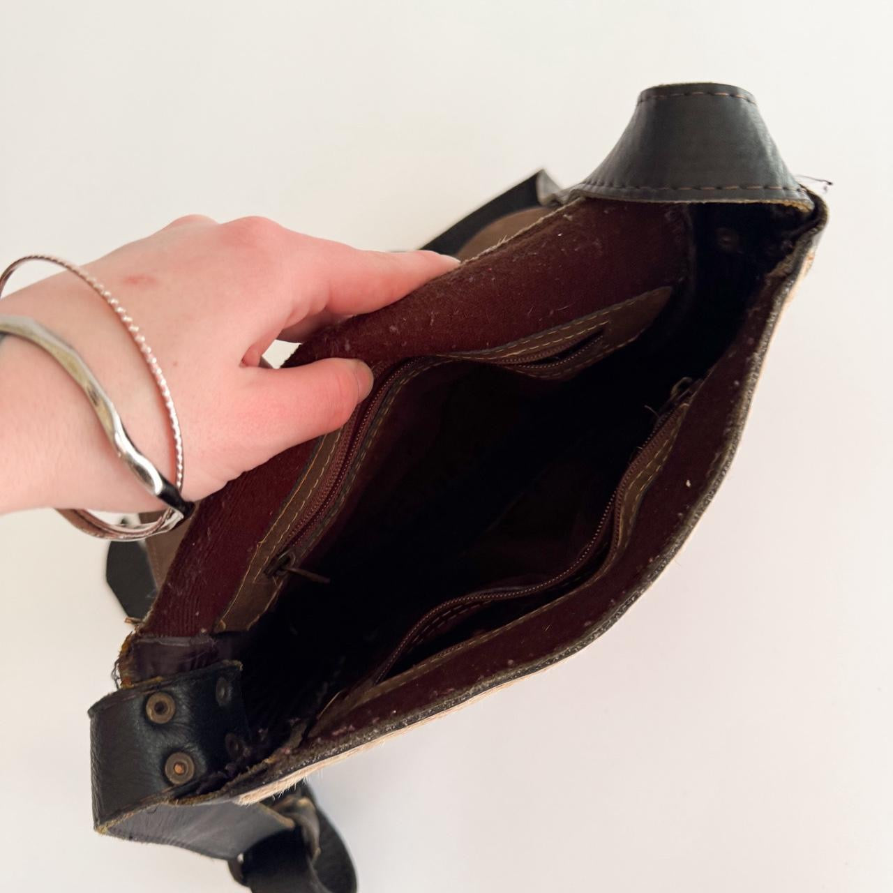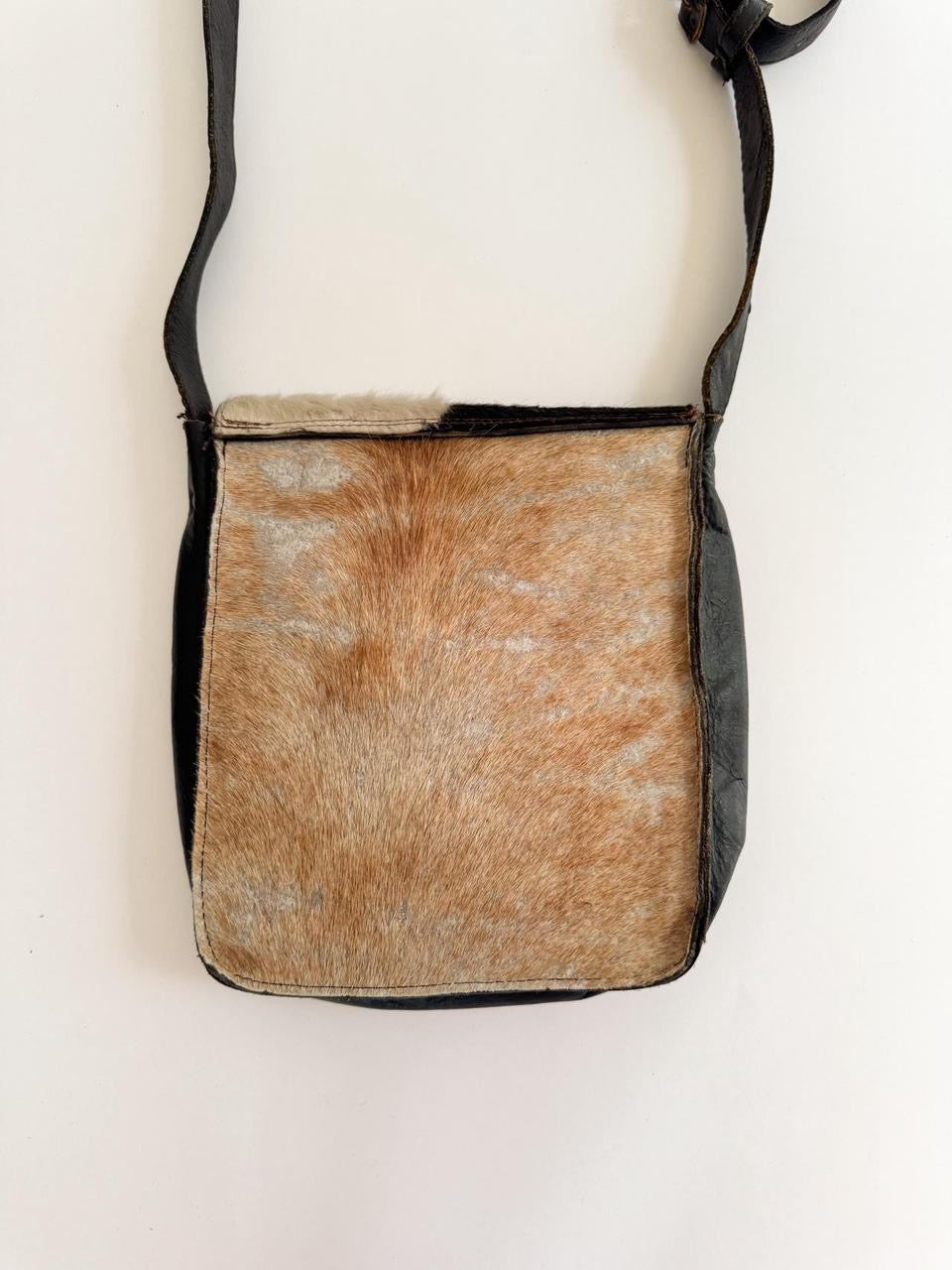 vintage 90s black leather & brown and cream calf hair crossbody bag with buckle details.