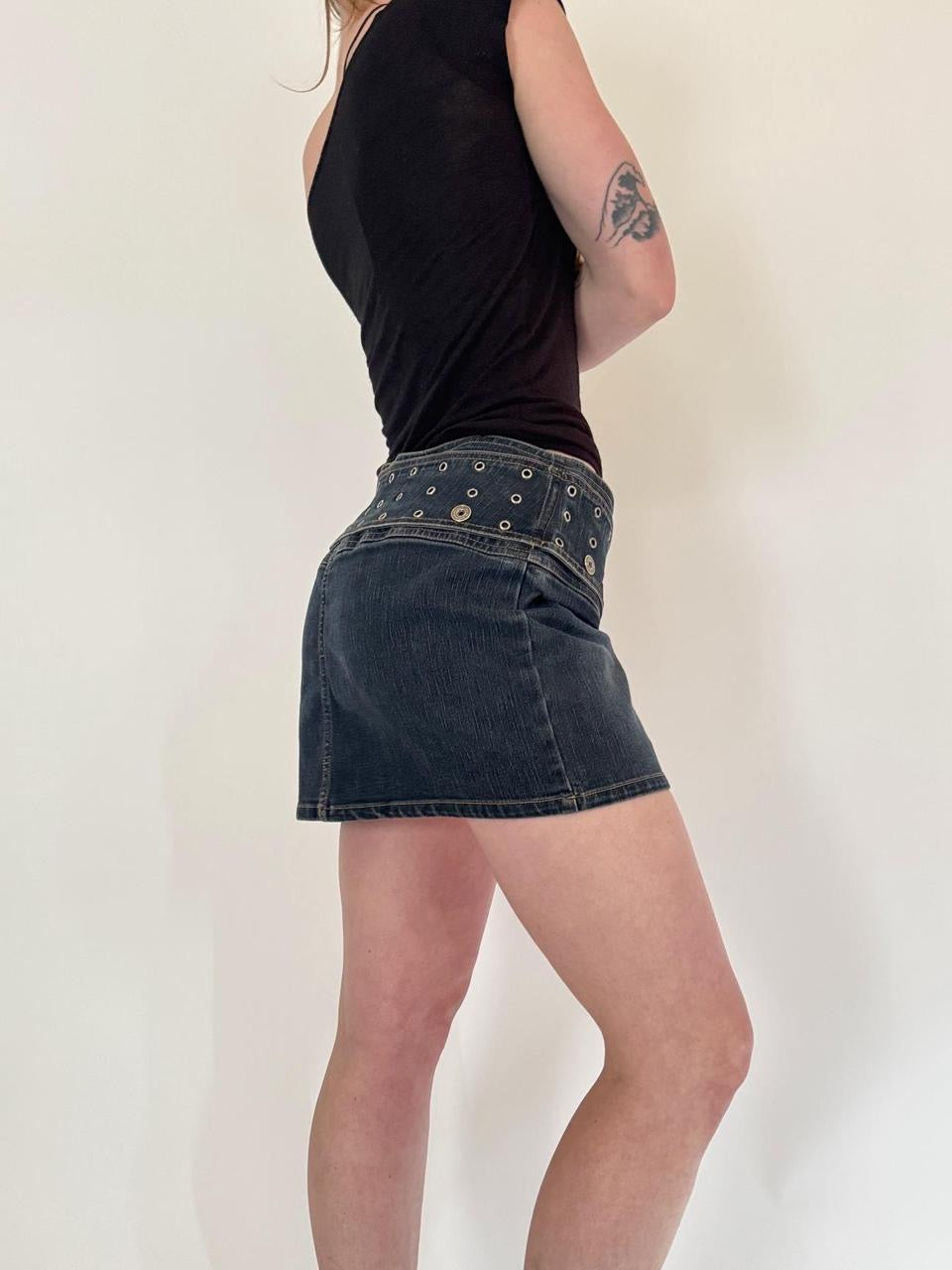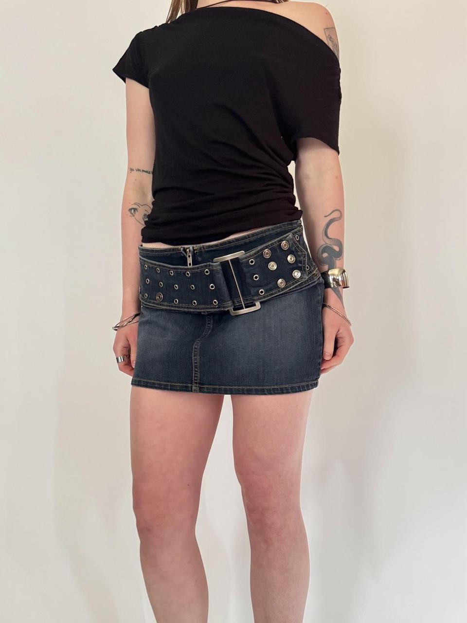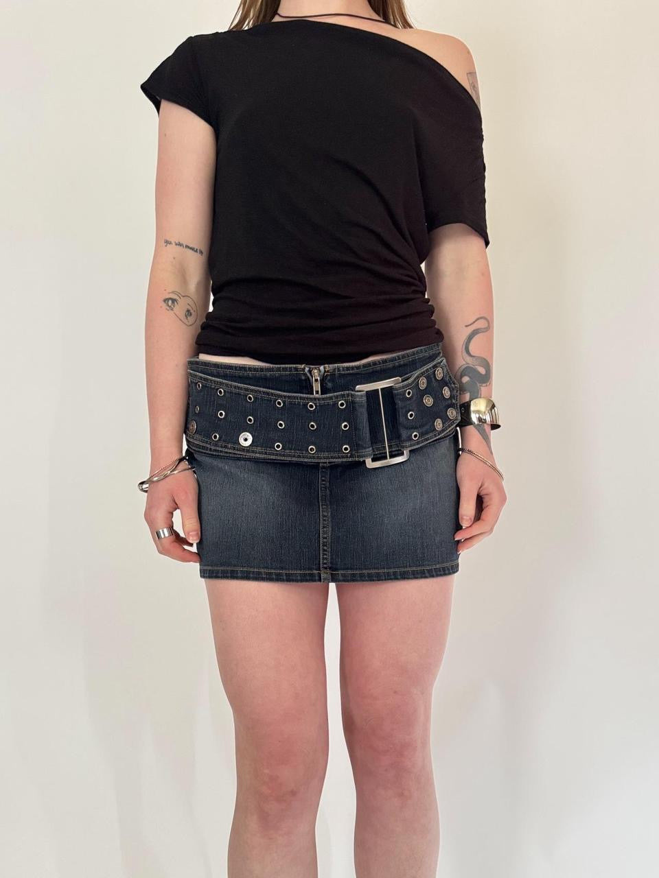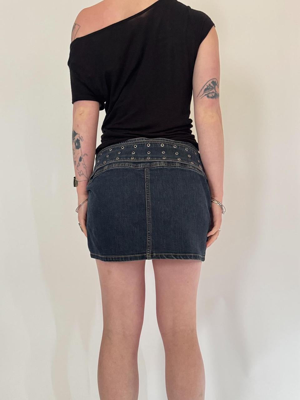 vintage early 00s “no boundaries” dark wash denim mini skirt with wide grommet studded belt & zipper.