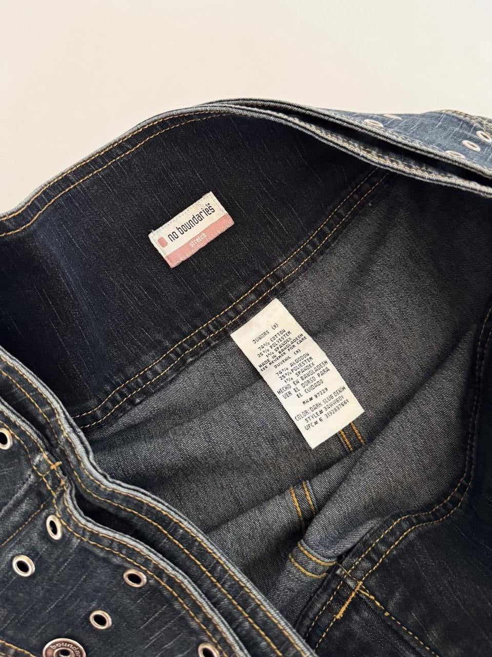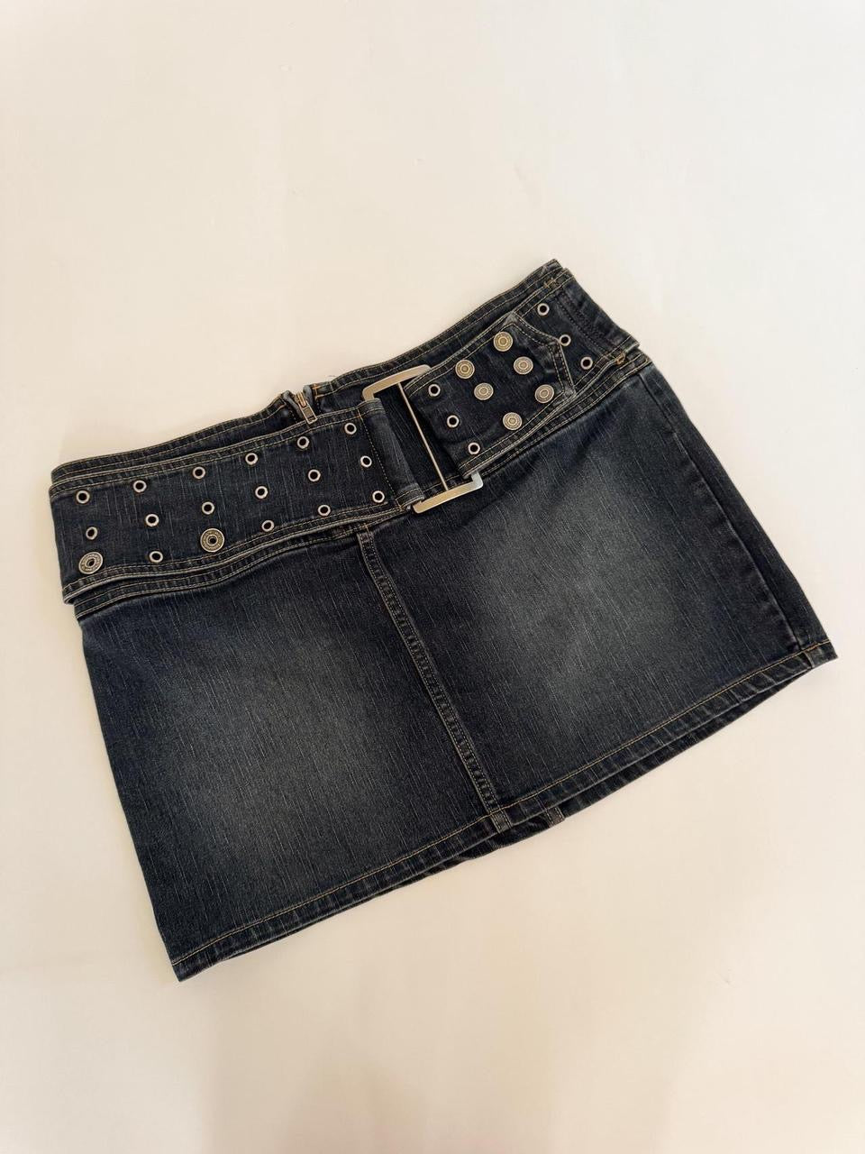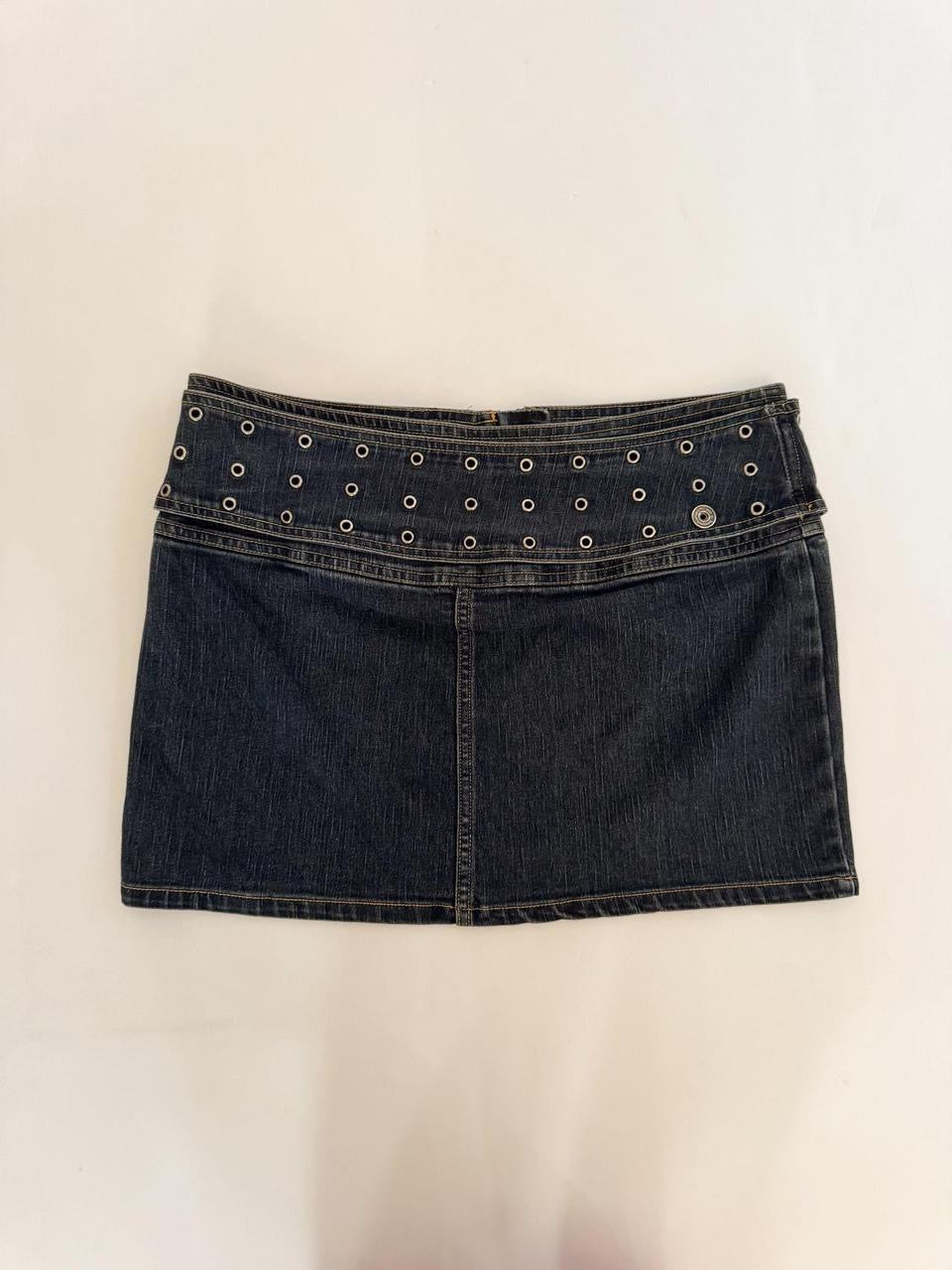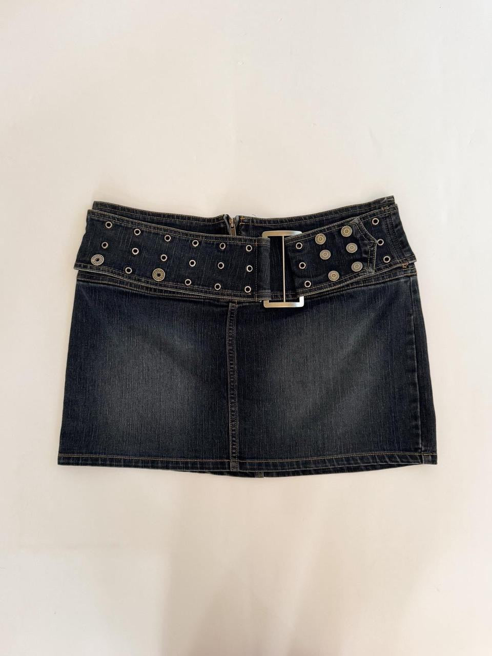 vintage early 00s “no boundaries” dark wash denim mini skirt with wide grommet studded belt & zipper.