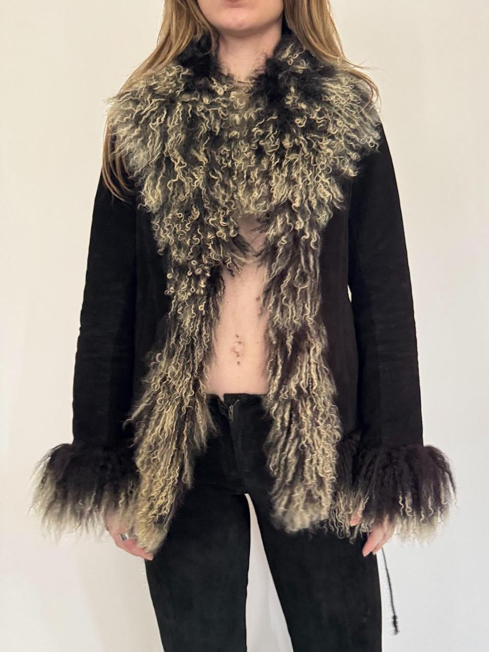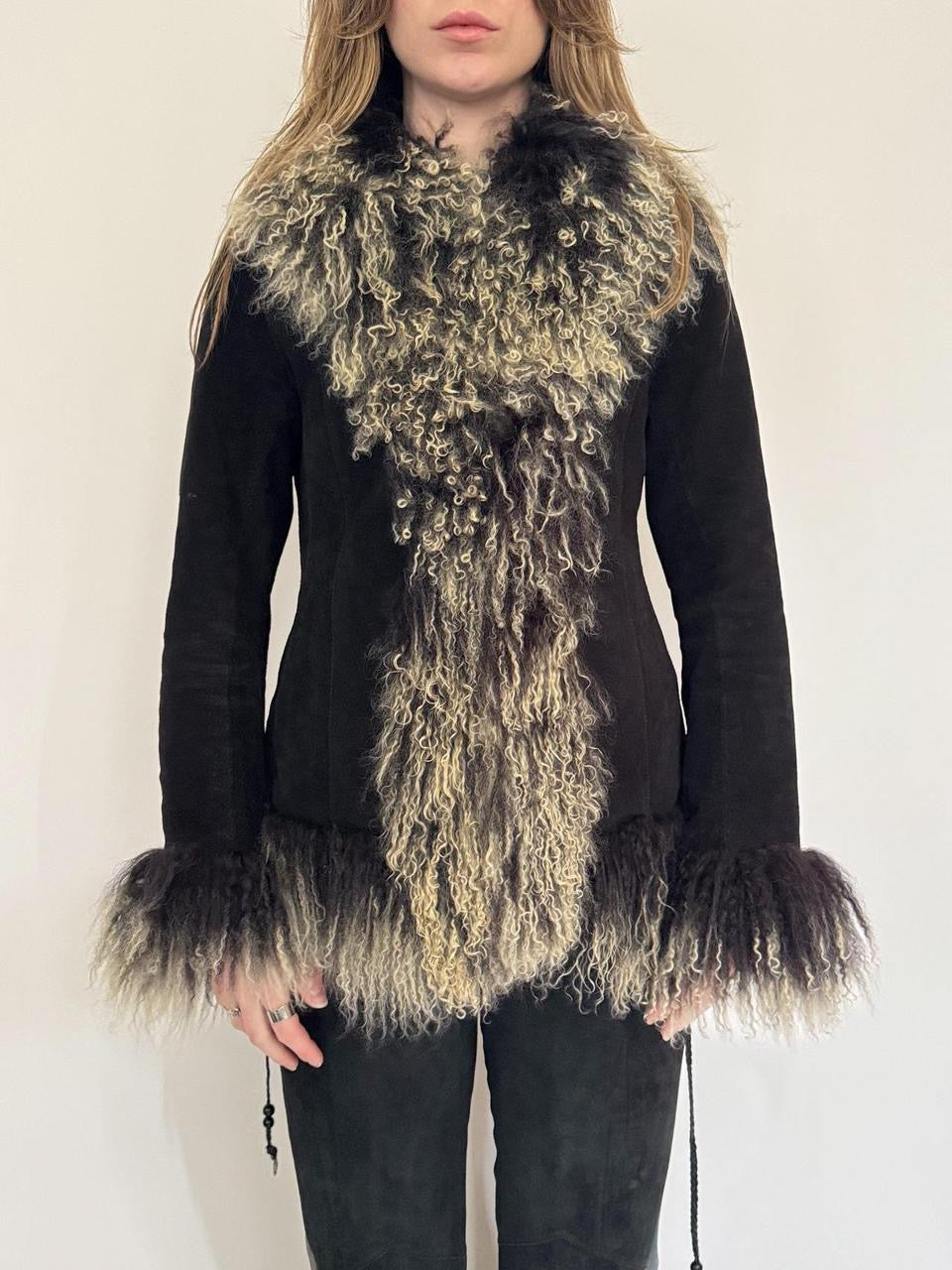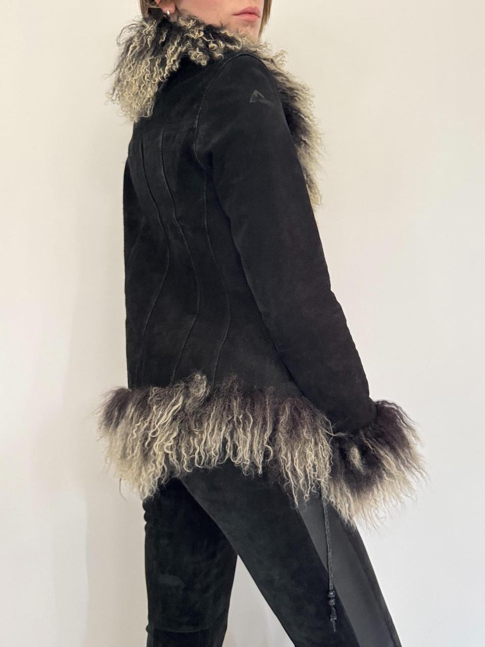 super rare “monsoon” black genuine suede leather cream mongolian curly goat fur trim coat.
