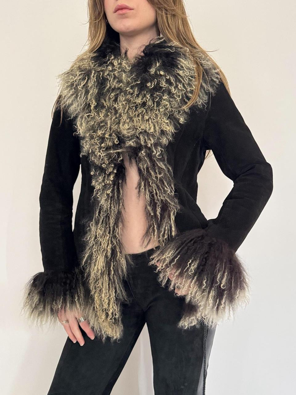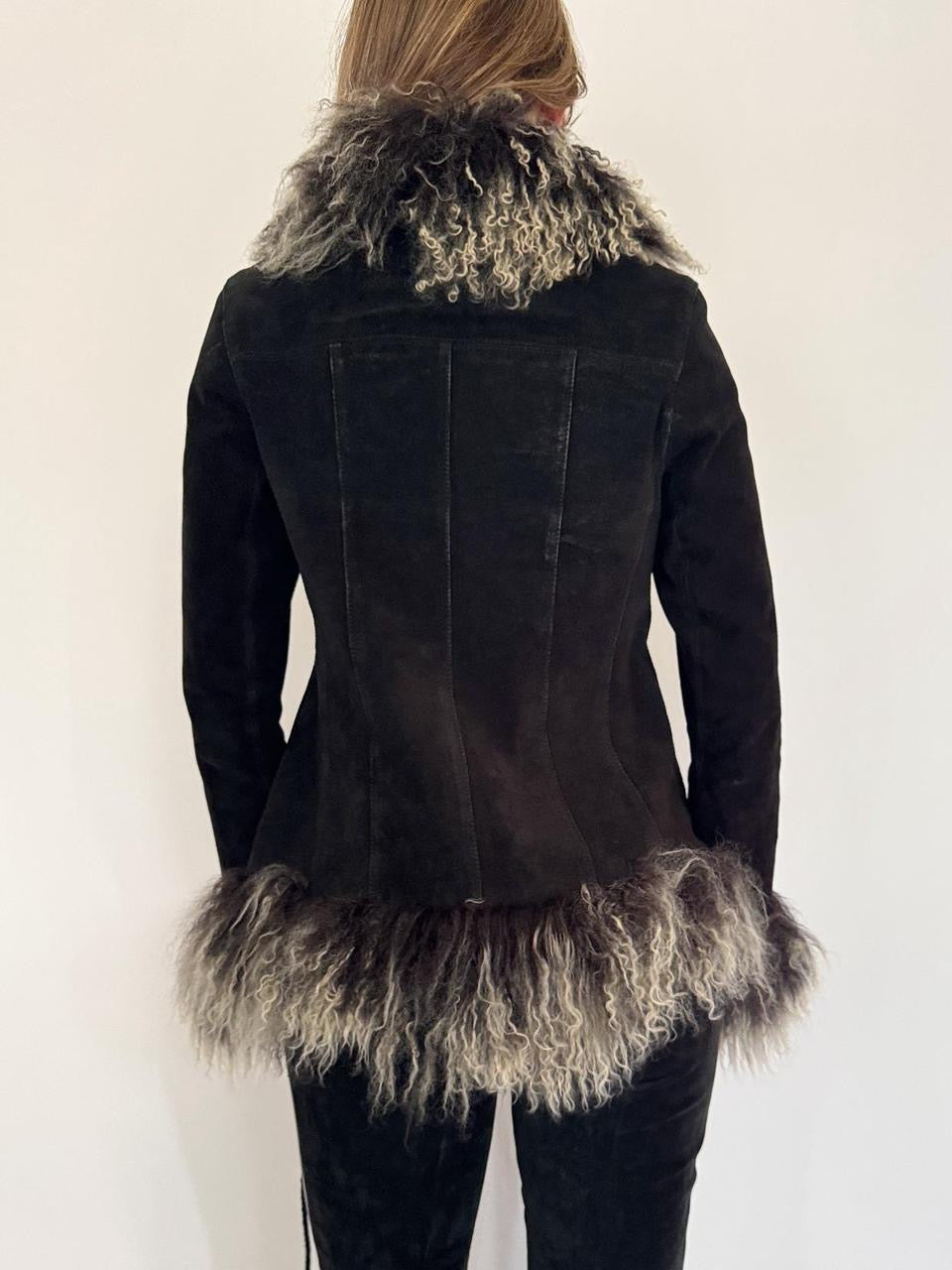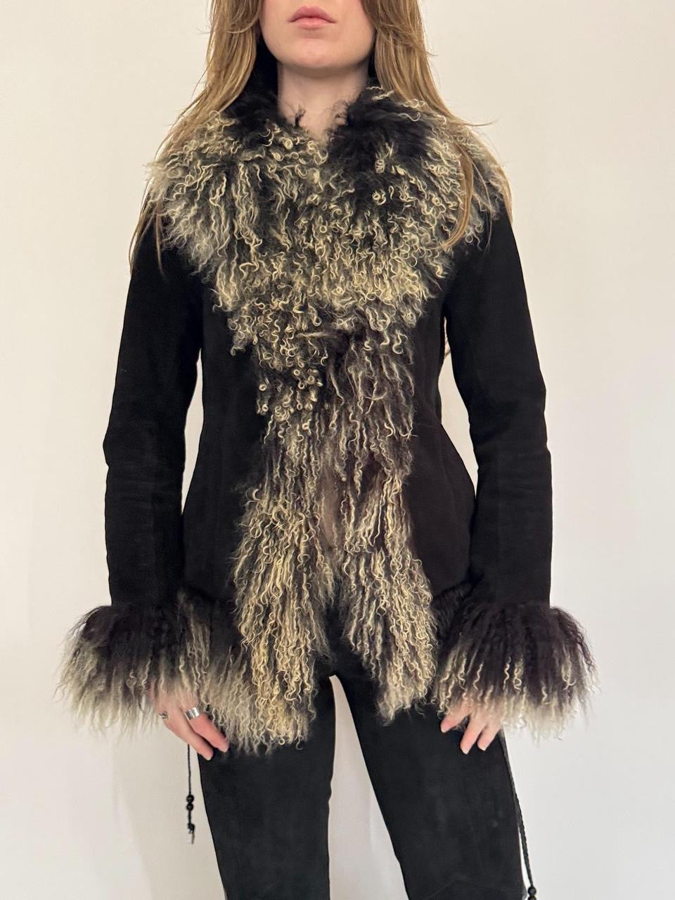 super rare “monsoon” black genuine suede leather cream mongolian curly goat fur trim coat.