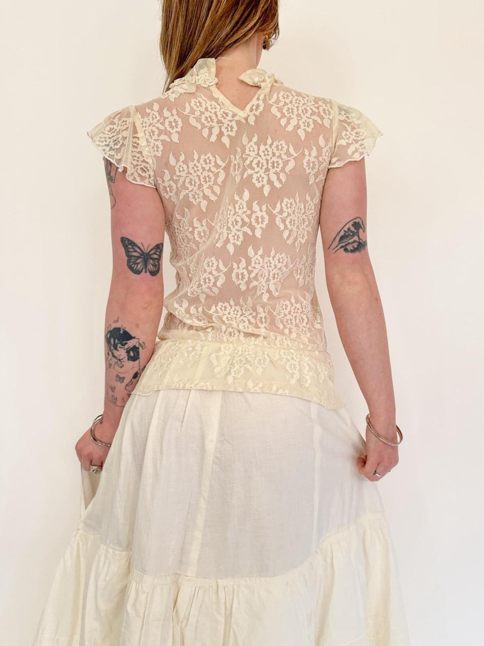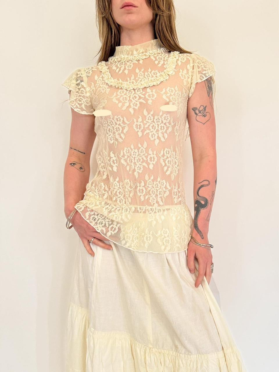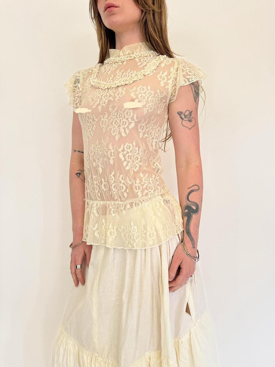vintage “lipsy” ruffled trim mock neck sheer lace fairy coquette blouse. *neck closure needs replaced*