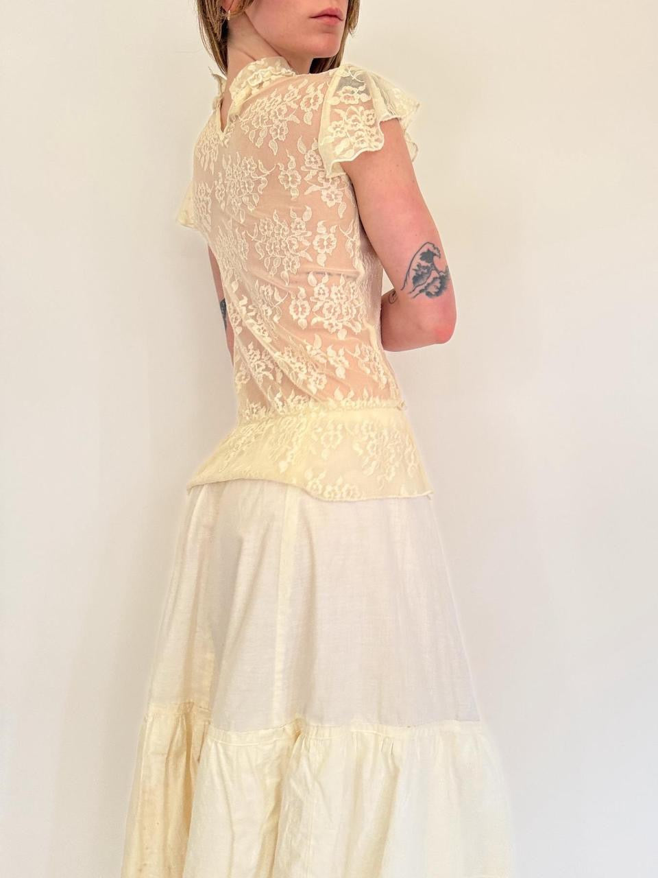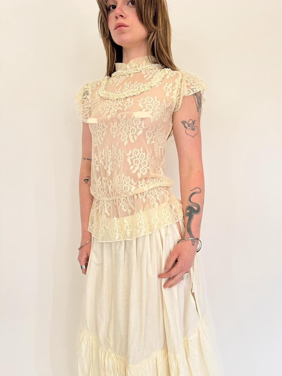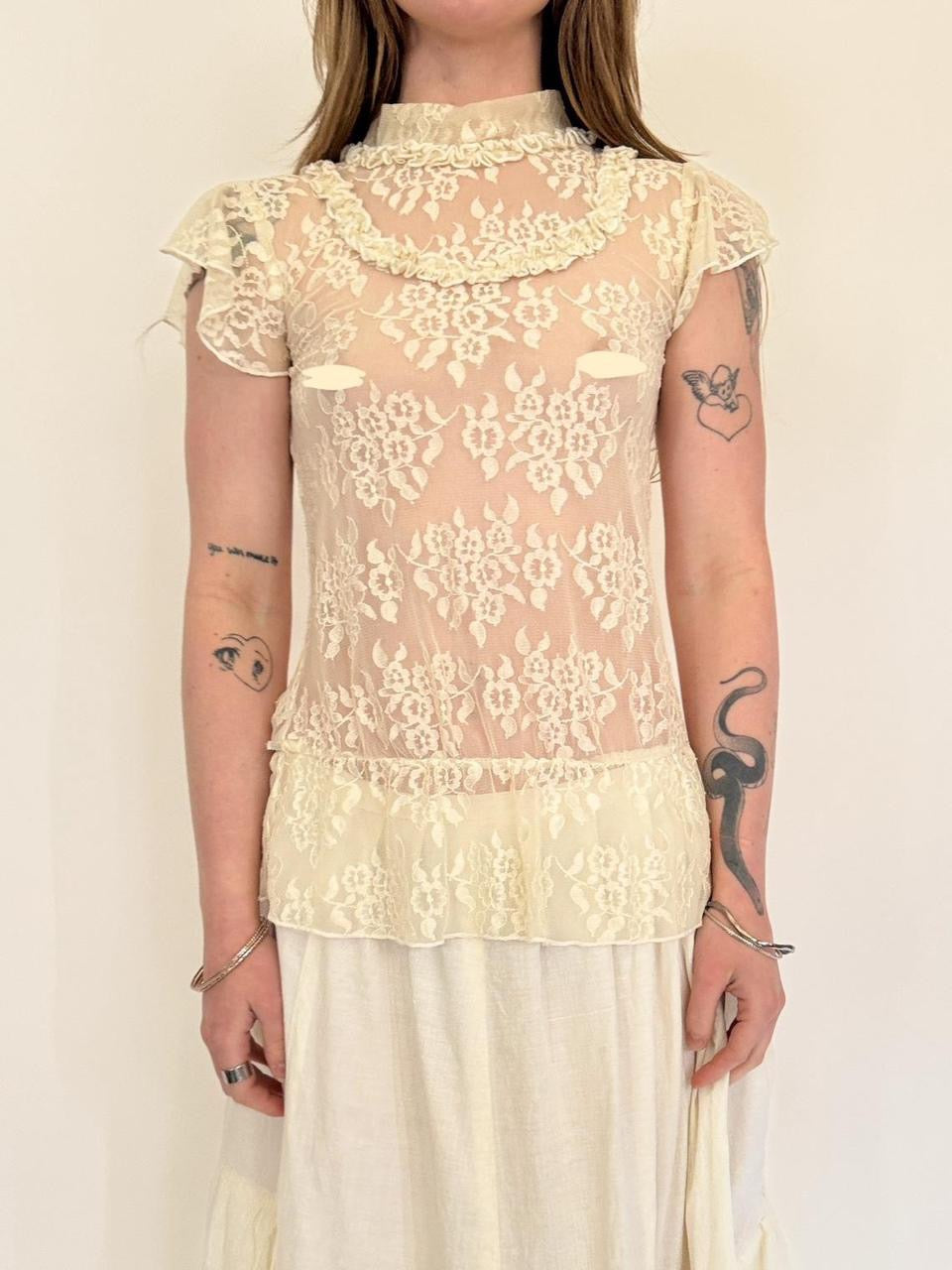 vintage “lipsy” ruffled trim mock neck sheer lace fairy coquette blouse. *neck closure needs replaced*