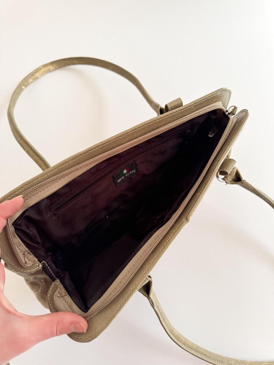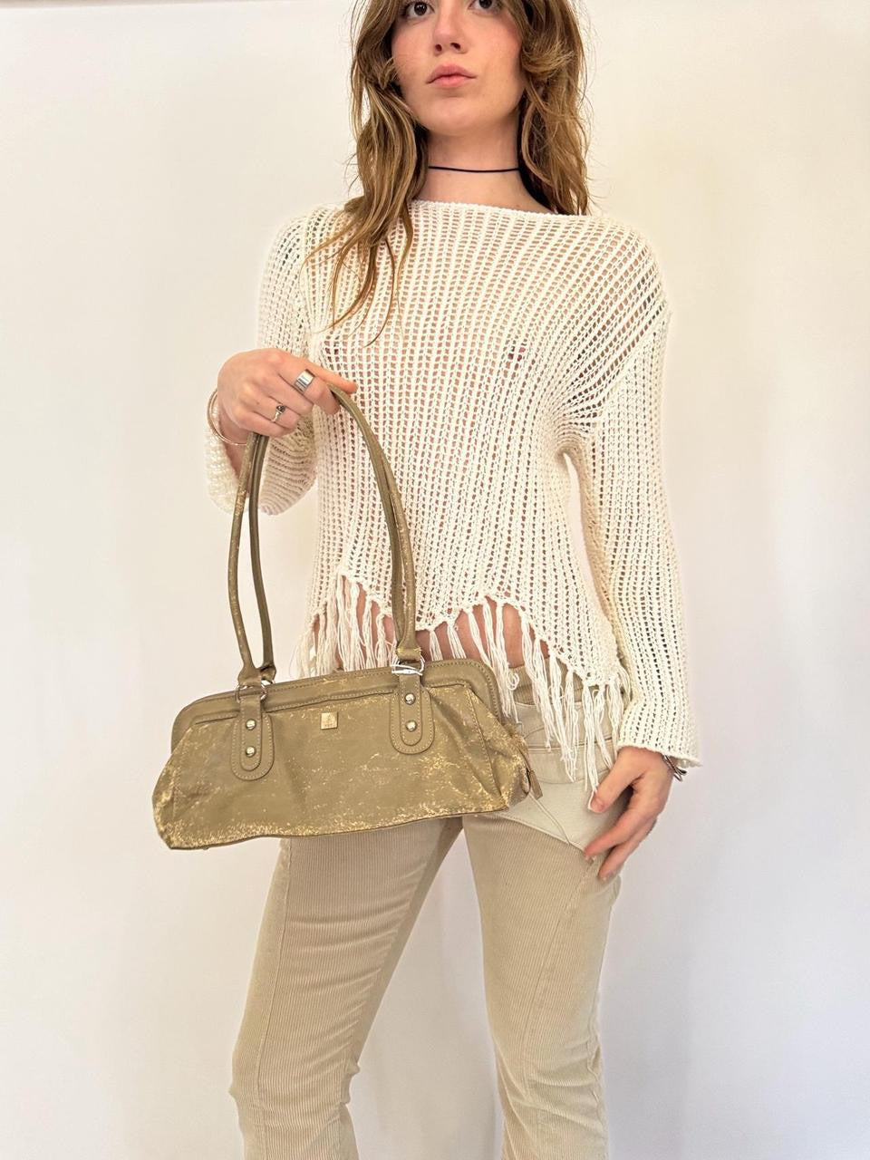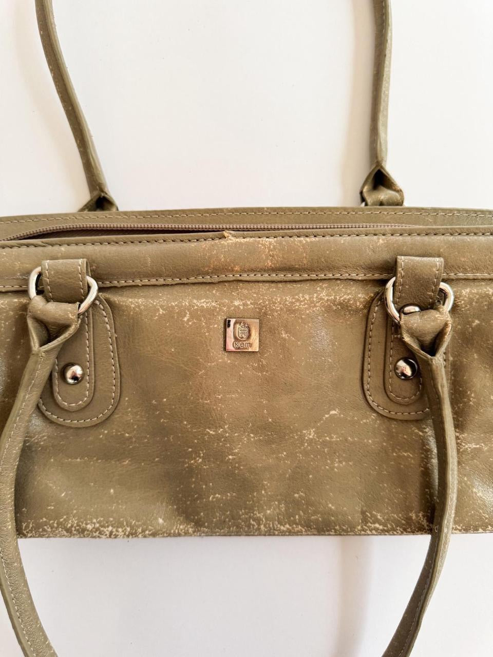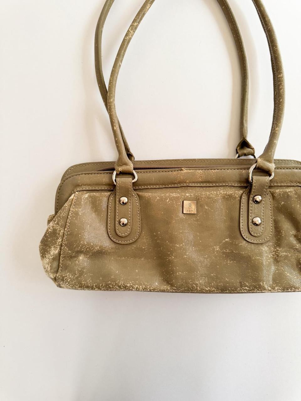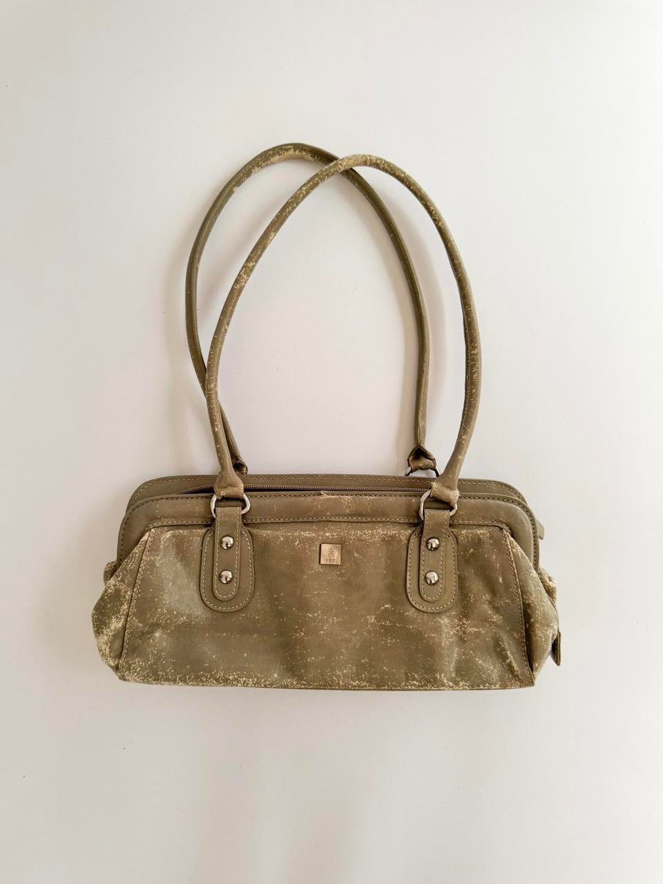 vintage “made by kem” grey worn distressed leather shoulder baguette bag. gunmetal silver studs. perfect subversive grunge basic.