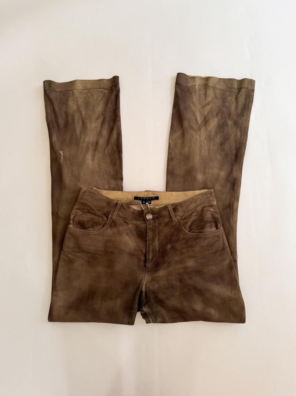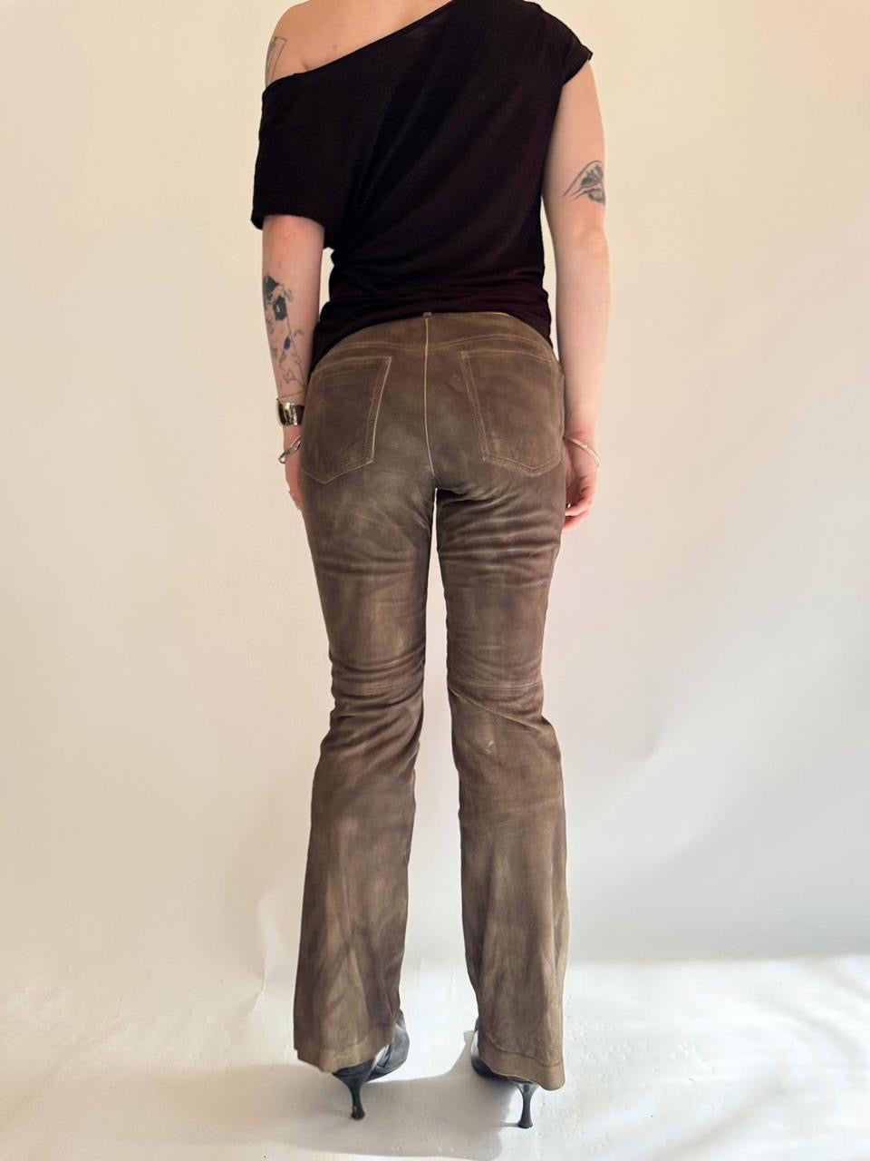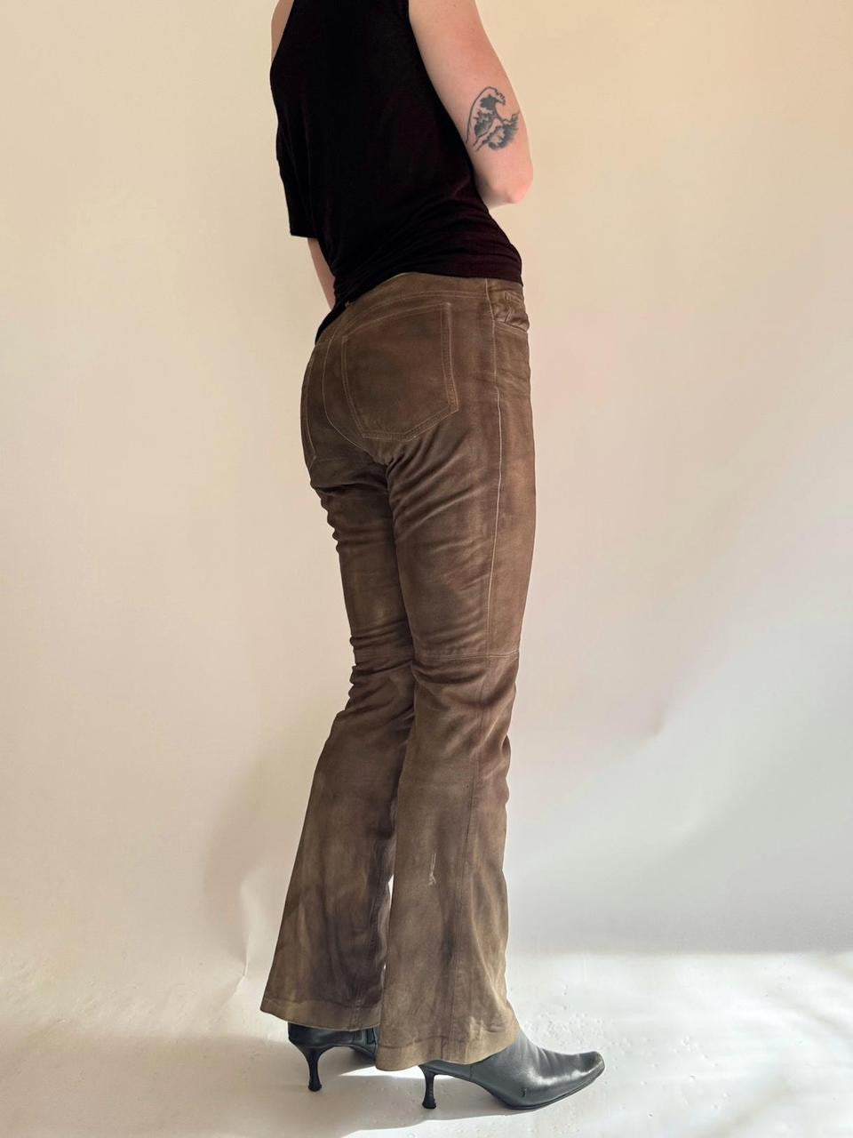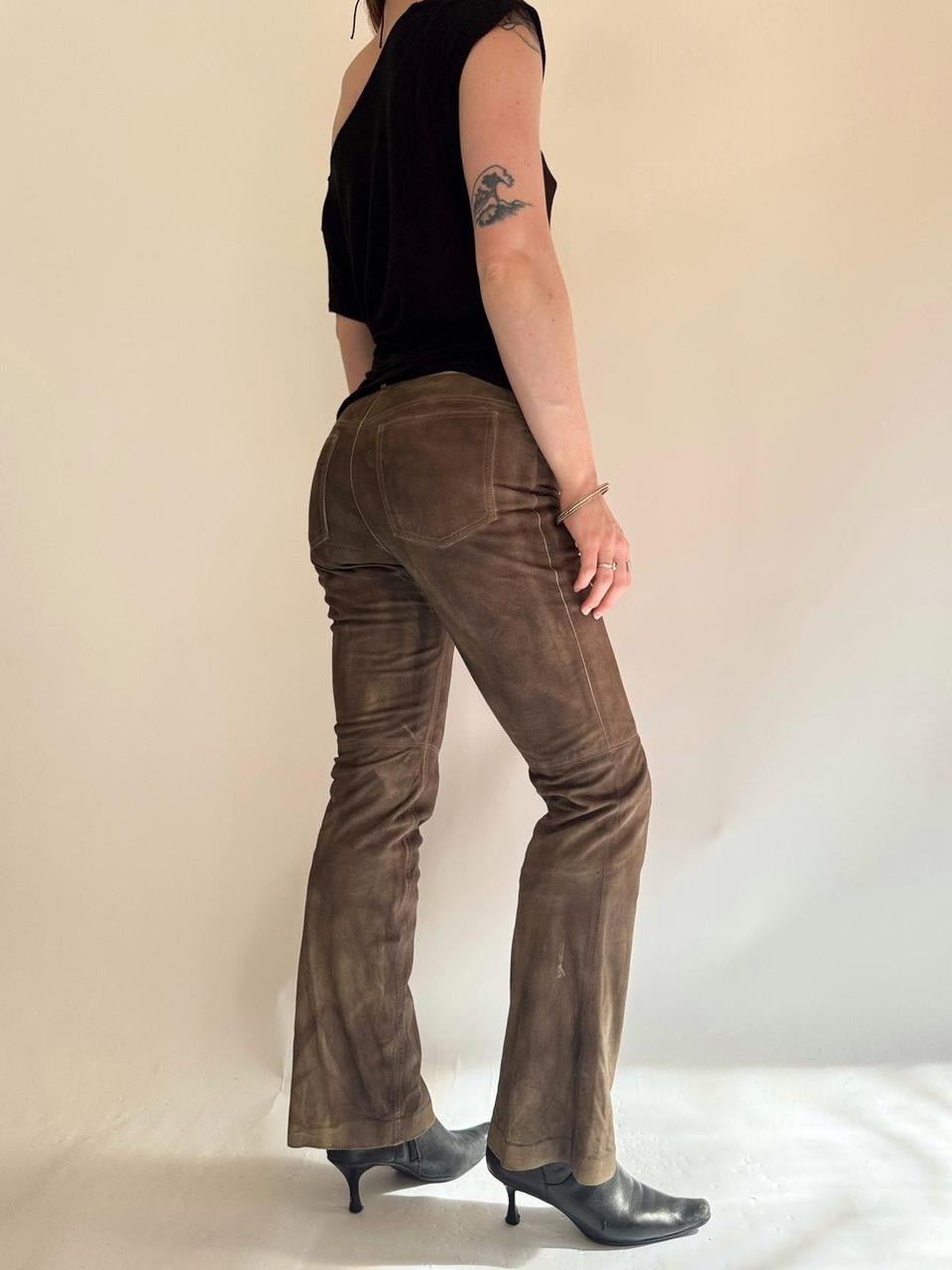 vintage “theory” brown genuine leather suede low rise flare bootcut pants. insane distressed faded look. *one small tear on bottom back