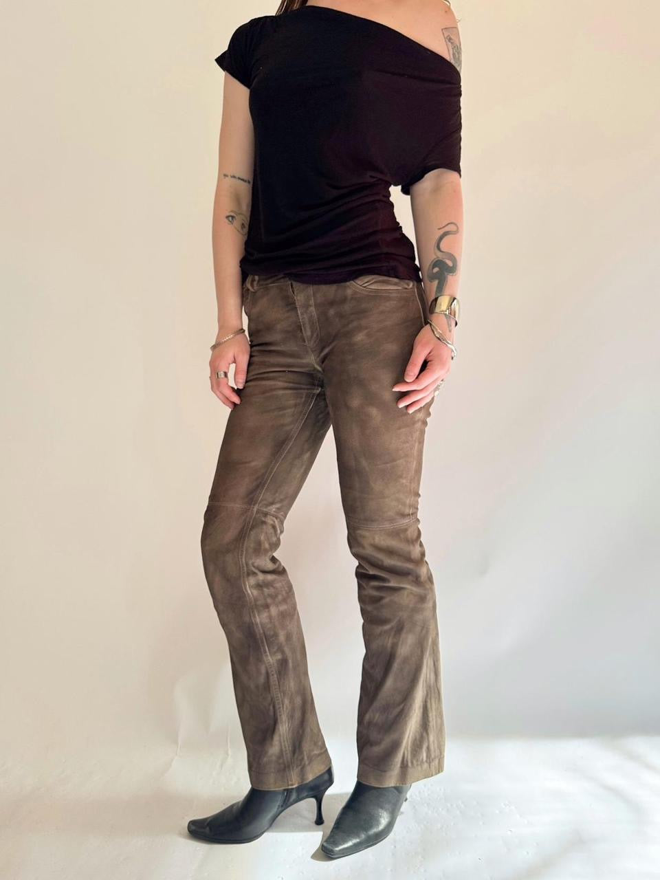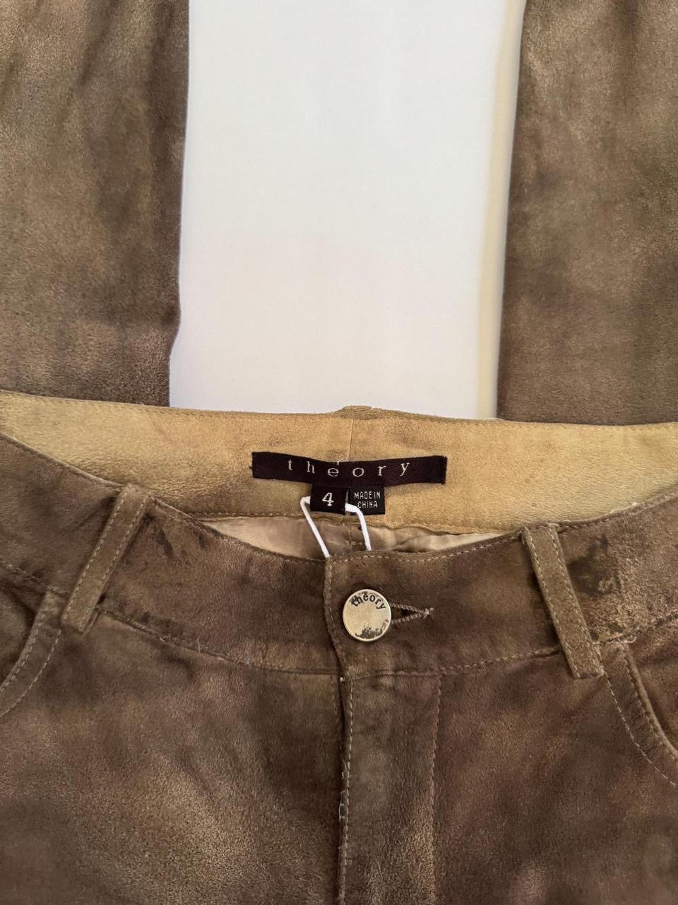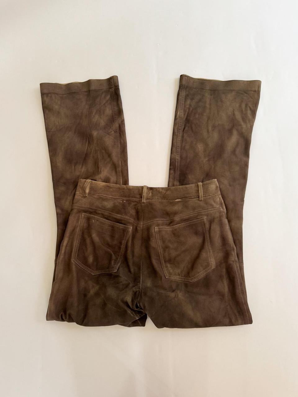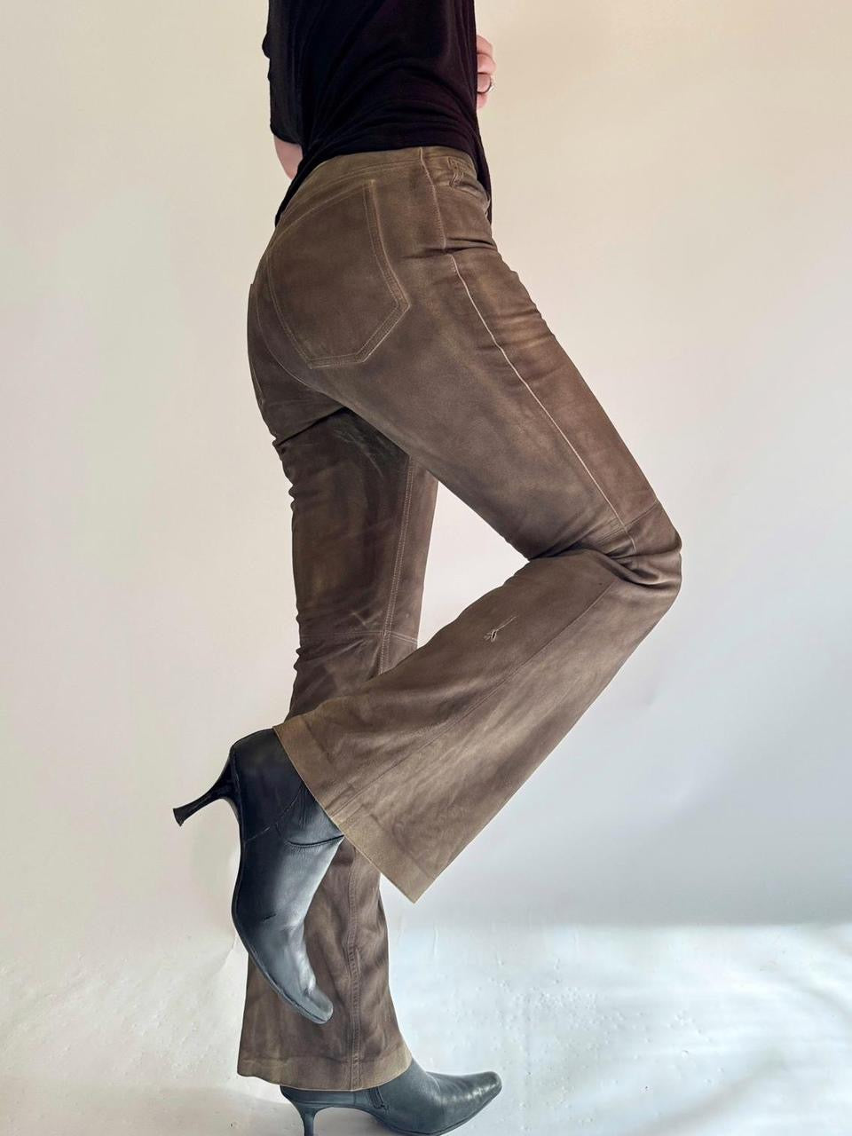 vintage “theory” brown genuine leather suede low rise flare bootcut pants. insane distressed faded look. *one small tear on bottom back