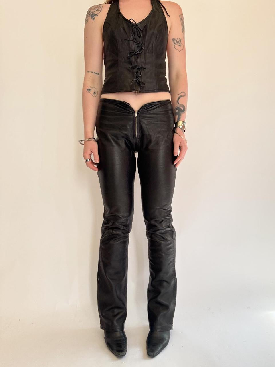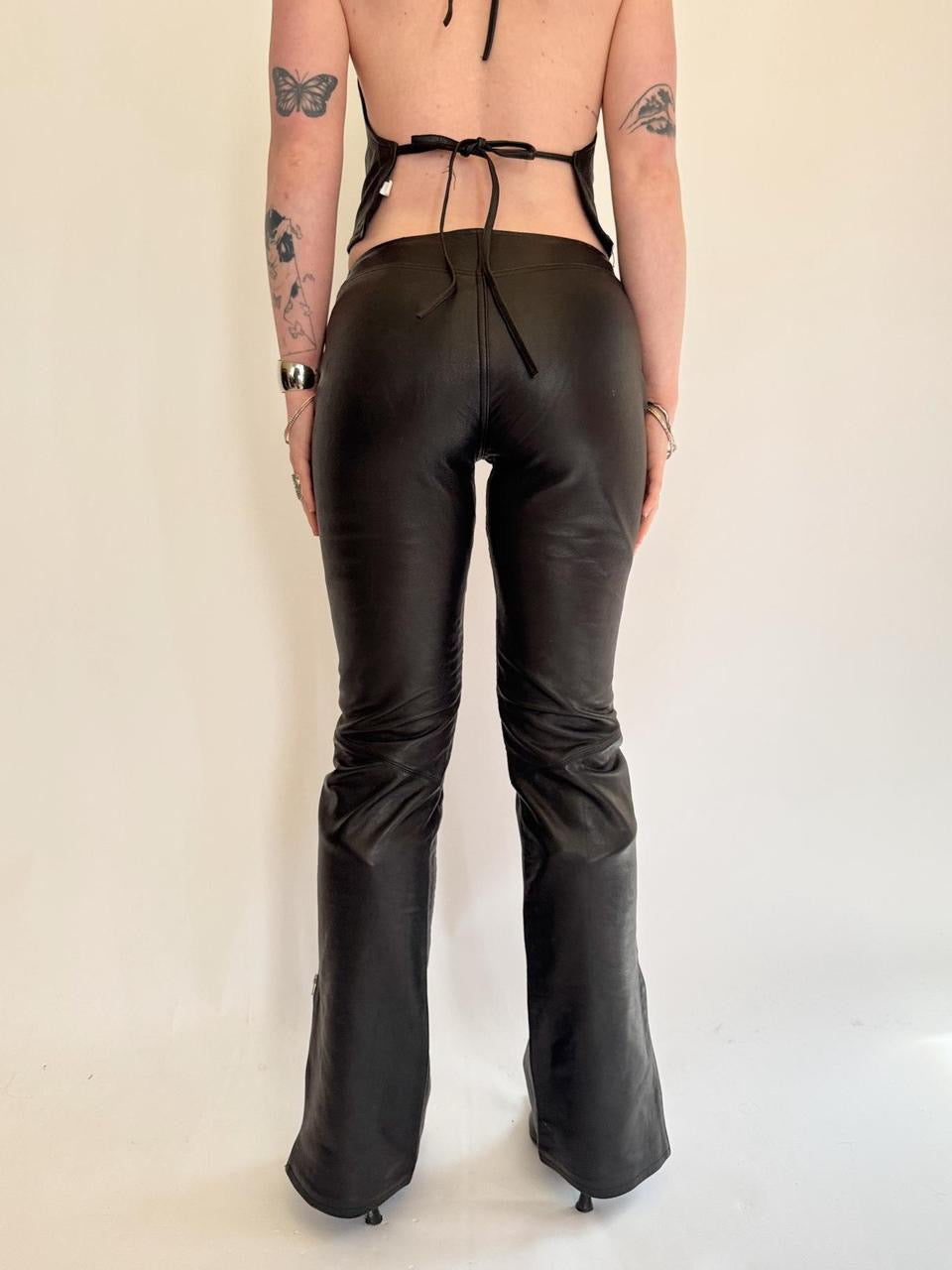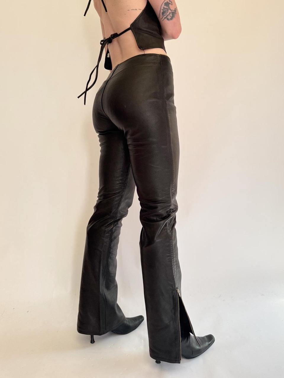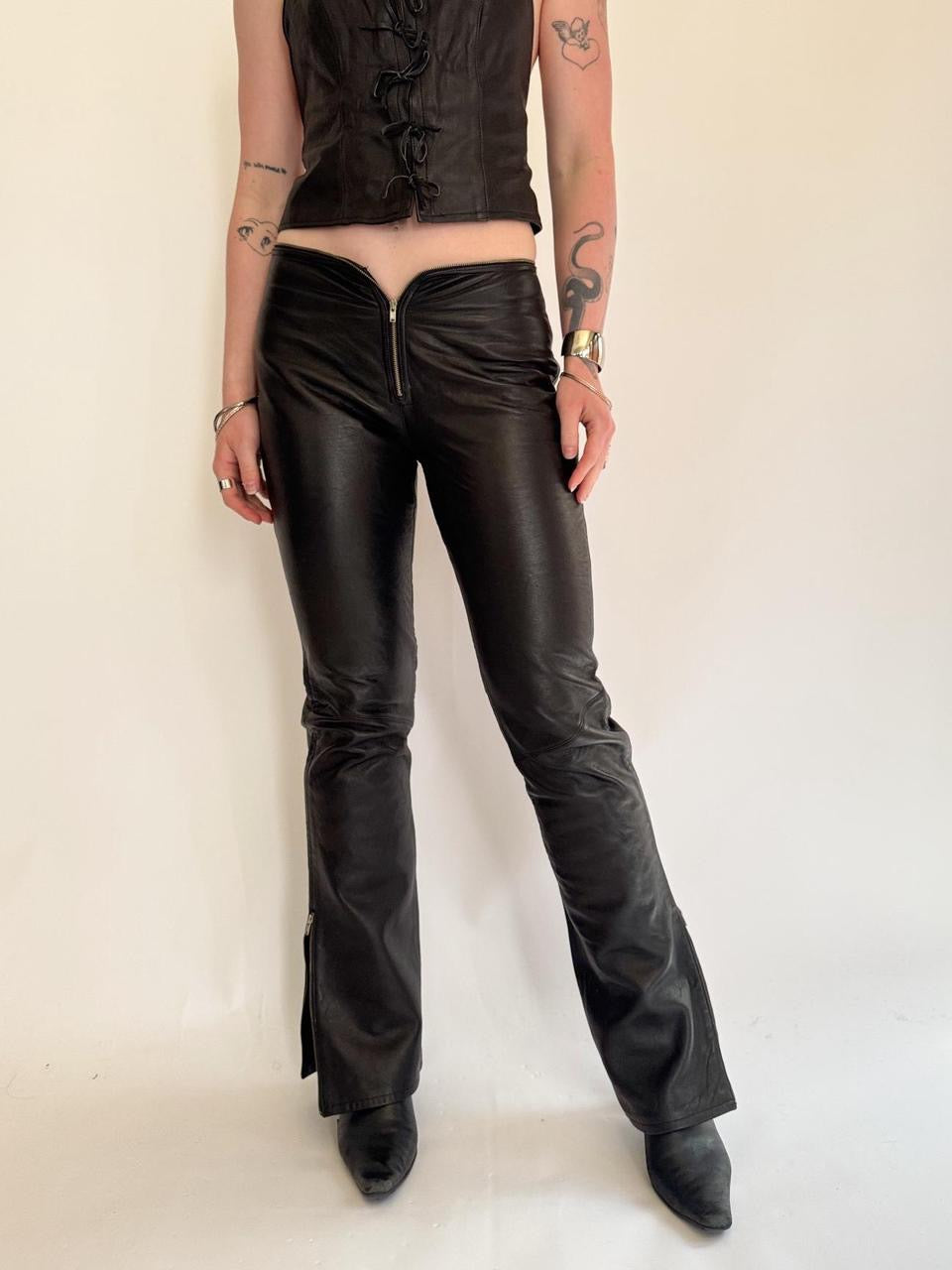 vintage “rem garson” black genuine leather low rise flare zipper ankle pants. insane curved zipper detail on waist.