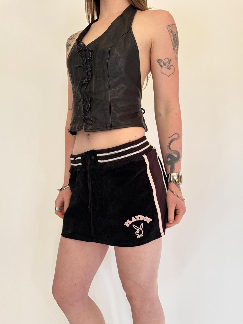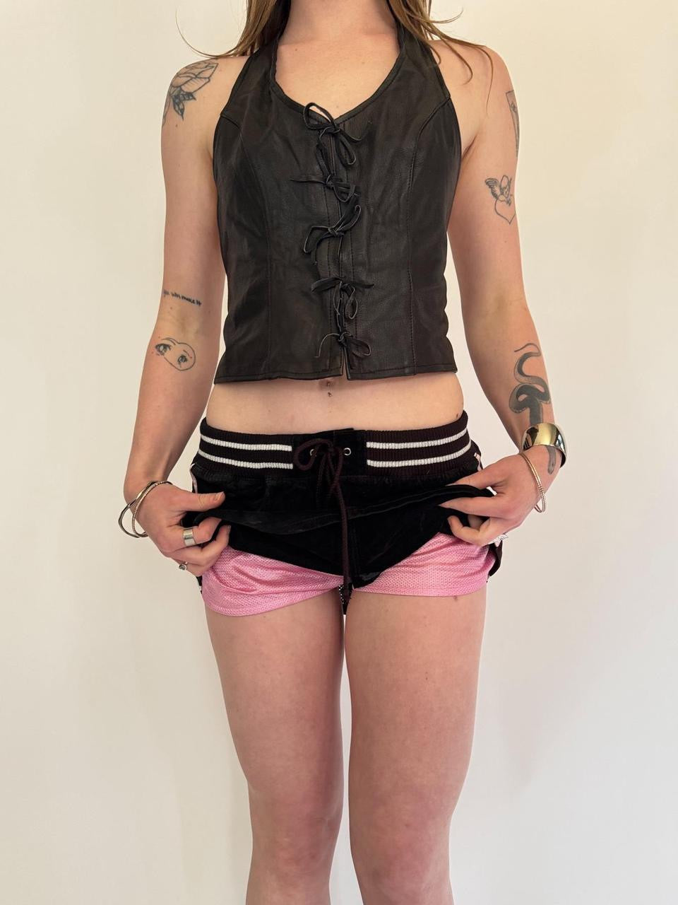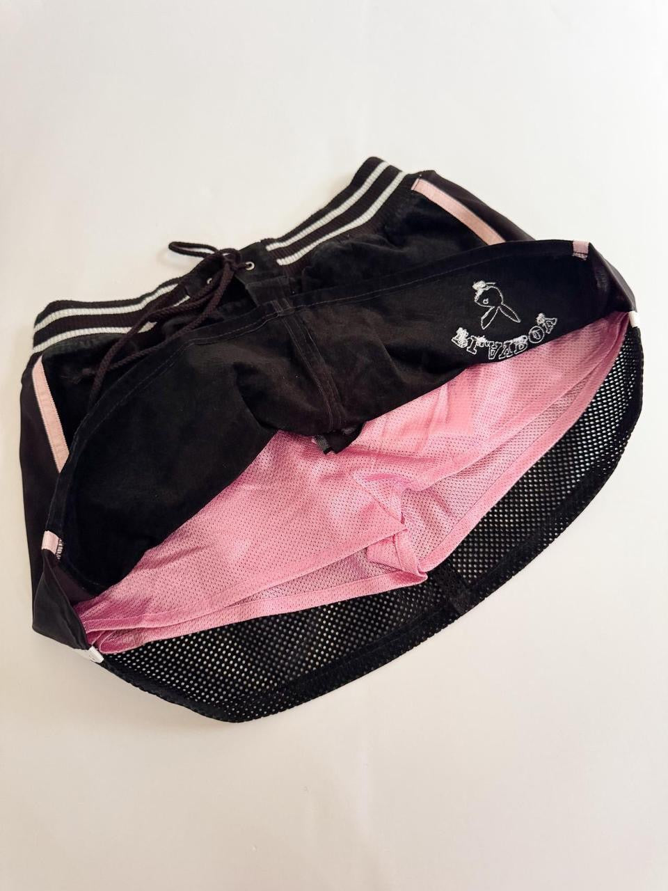 insane vintage “playboy” black and baby pink suede leather sporty style mini skirt / skort; athletic mesh panel in the back and built in shorts.