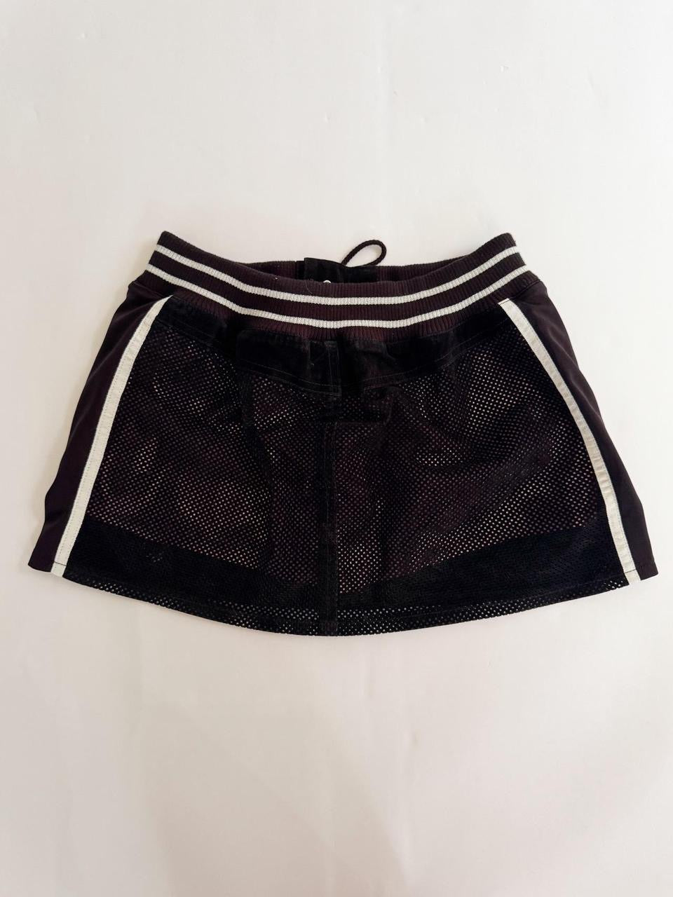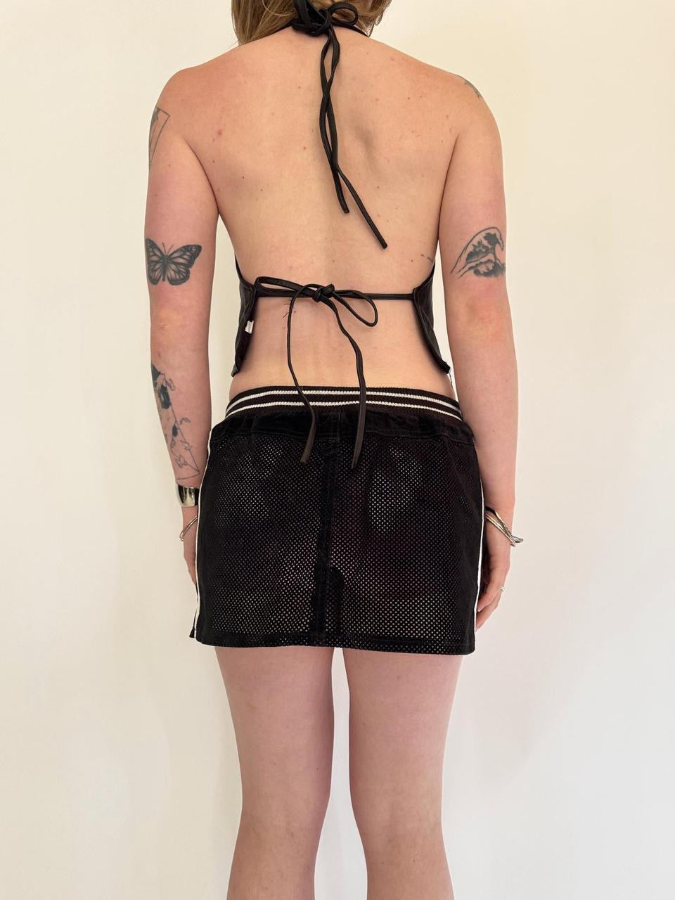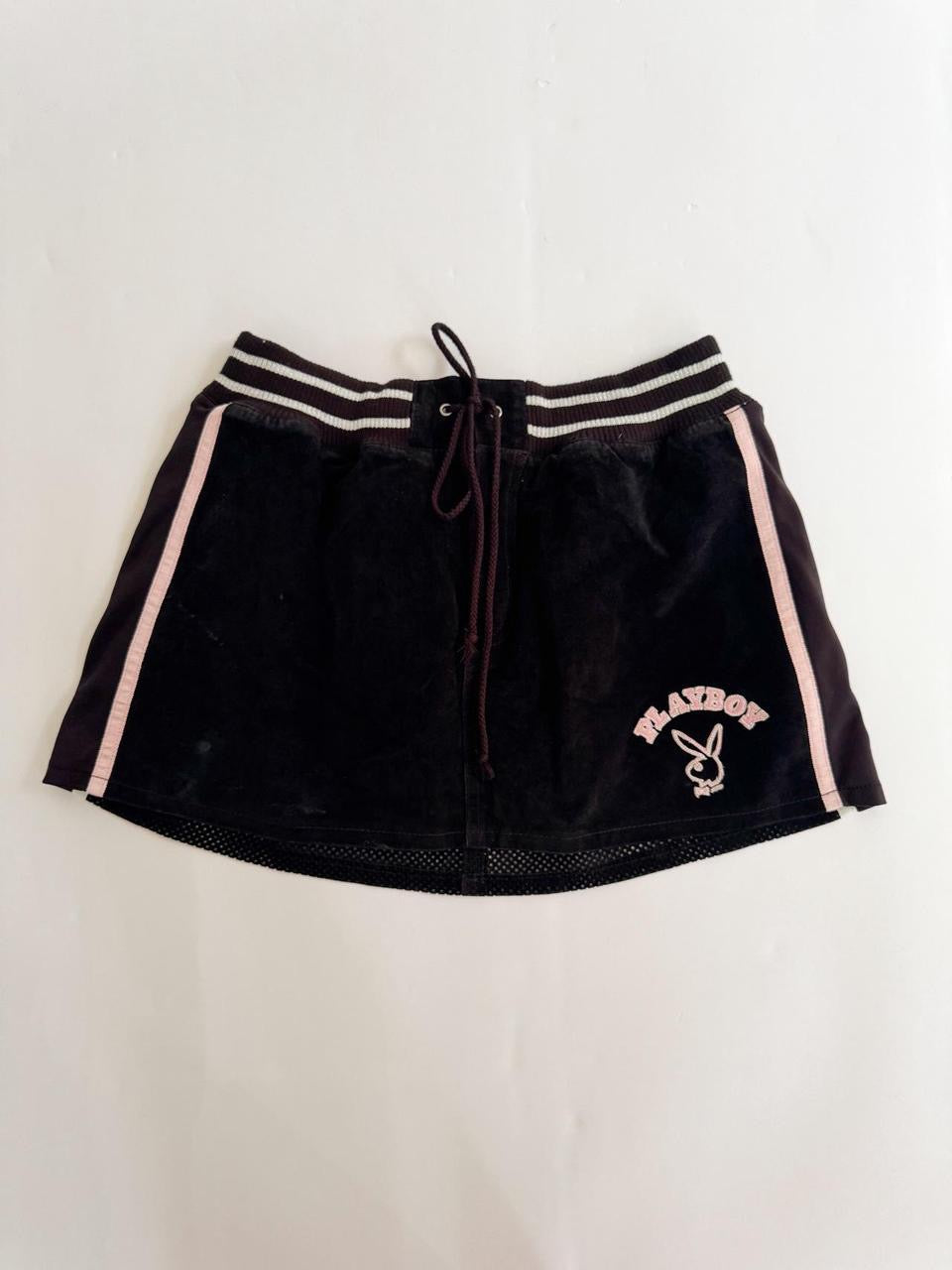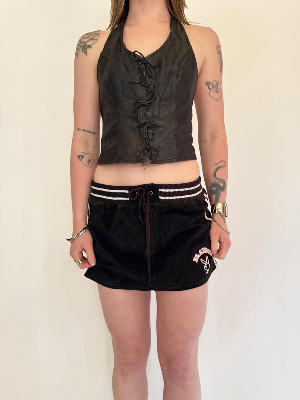 insane vintage “playboy” black and baby pink suede leather sporty style mini skirt / skort; athletic mesh panel in the back and built in shorts.