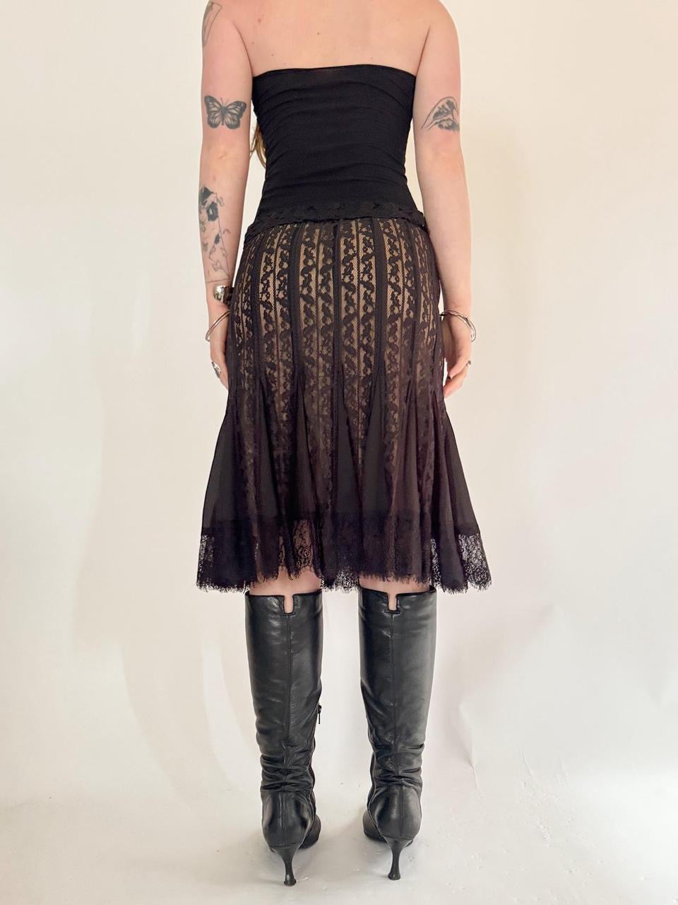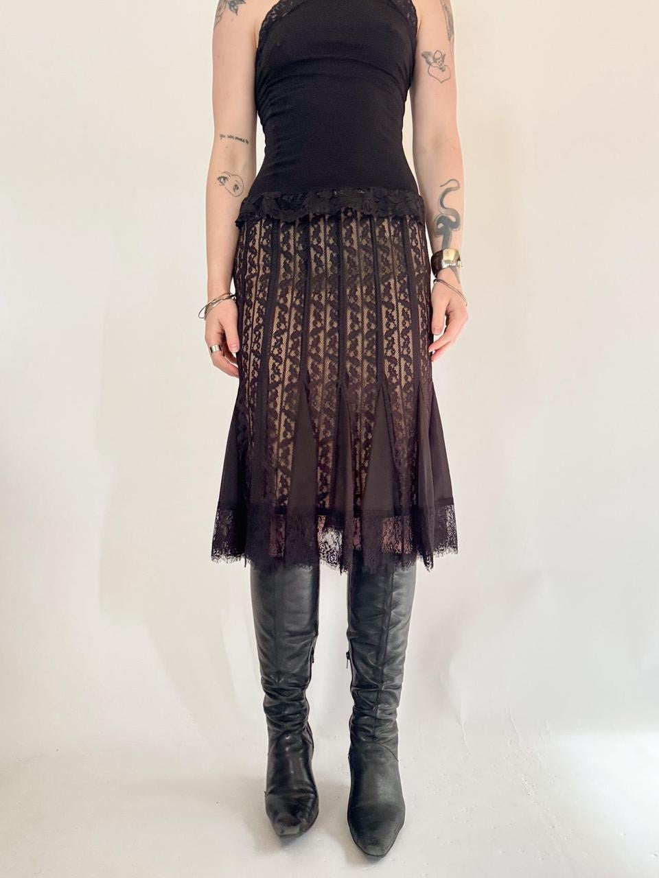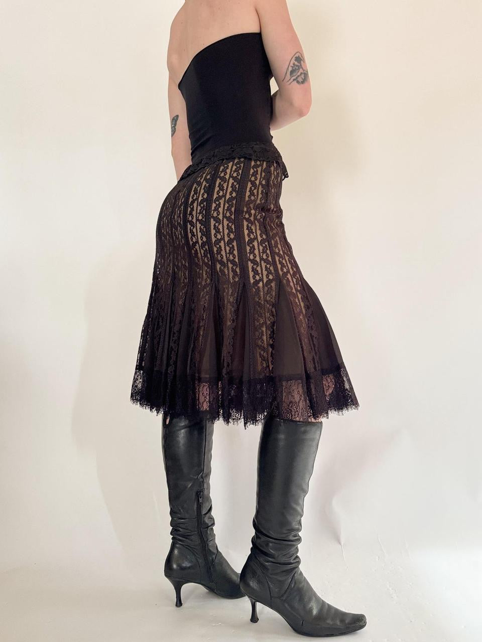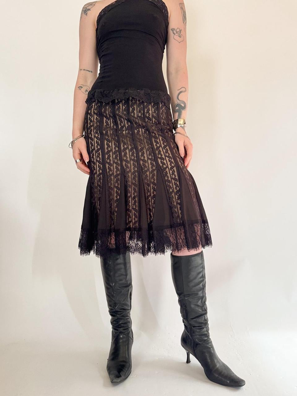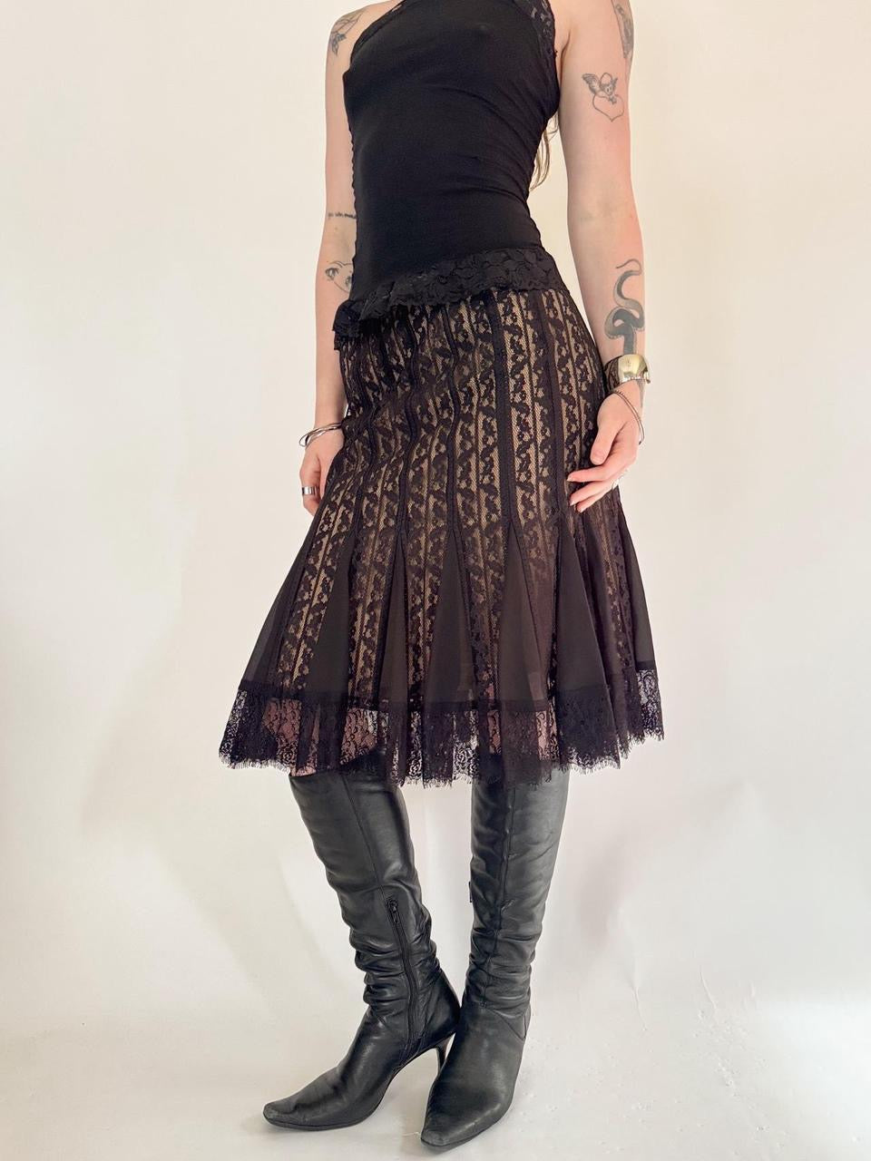 vintage “ann taylor loft” pleated black lace midi skirt with nude underlay; zipper closure on the side.