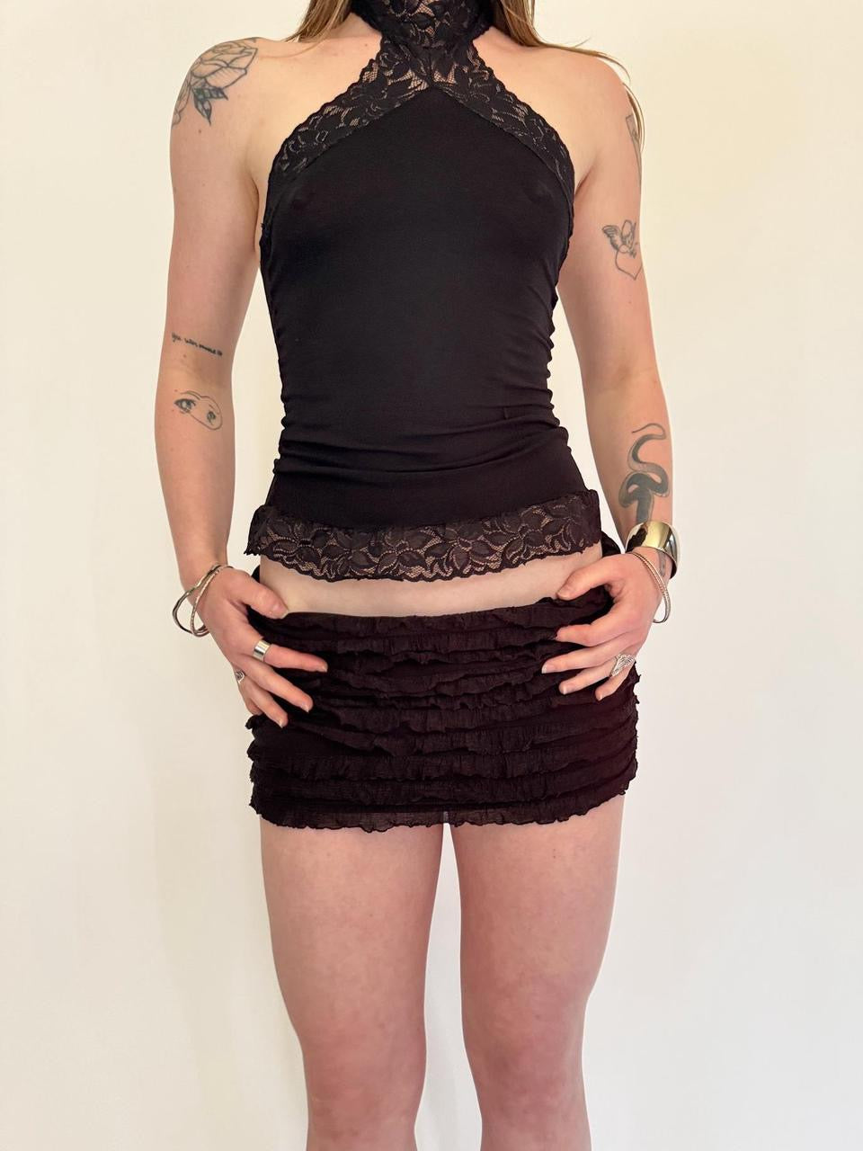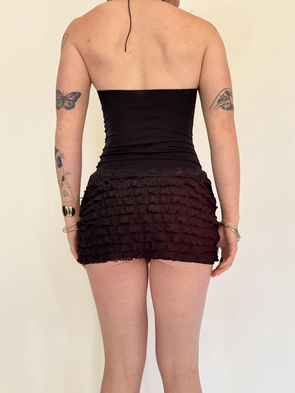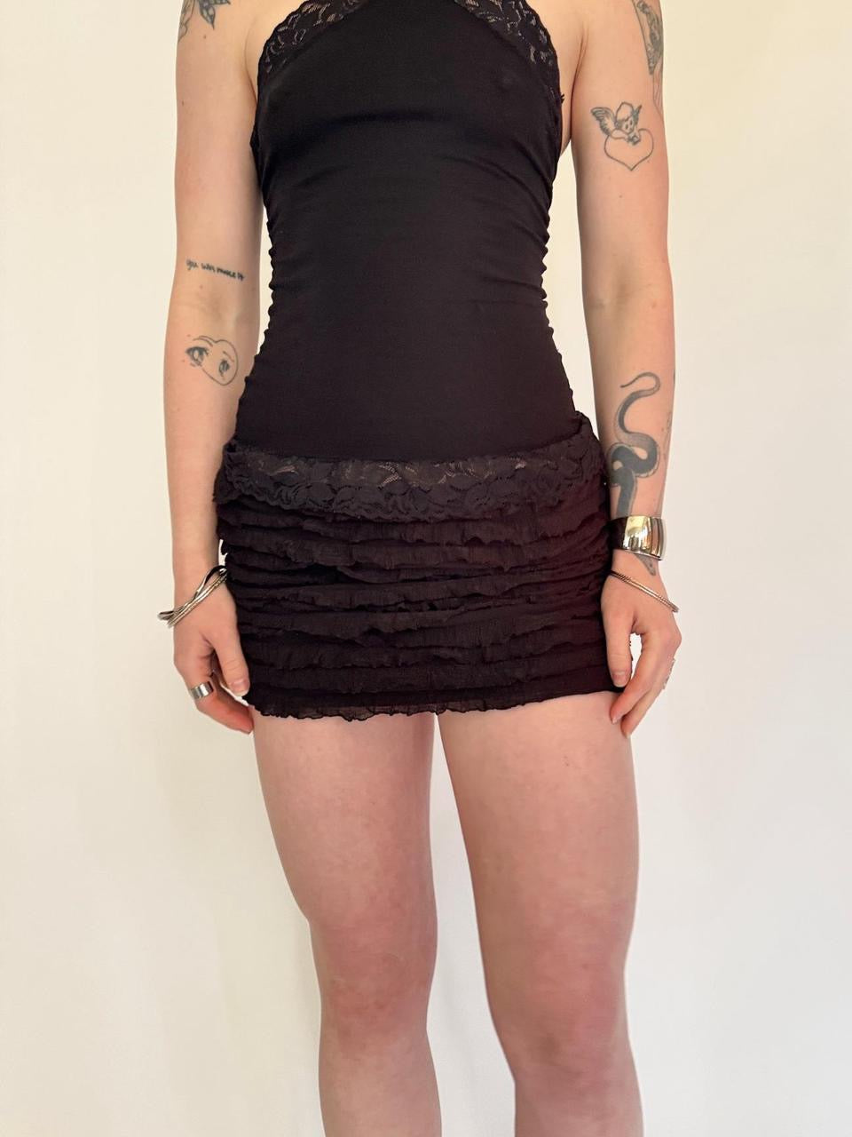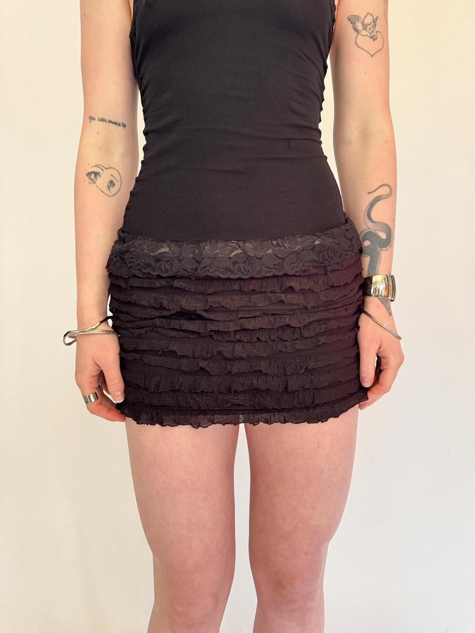 vintage early 00s “forever 21” black ruffled mini skirt with elastic waistband. could be folded inwards to be micro mini.