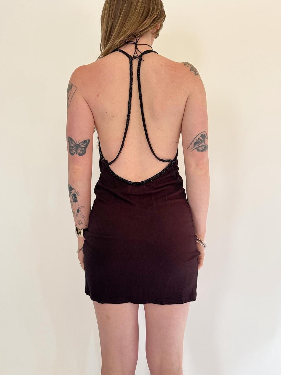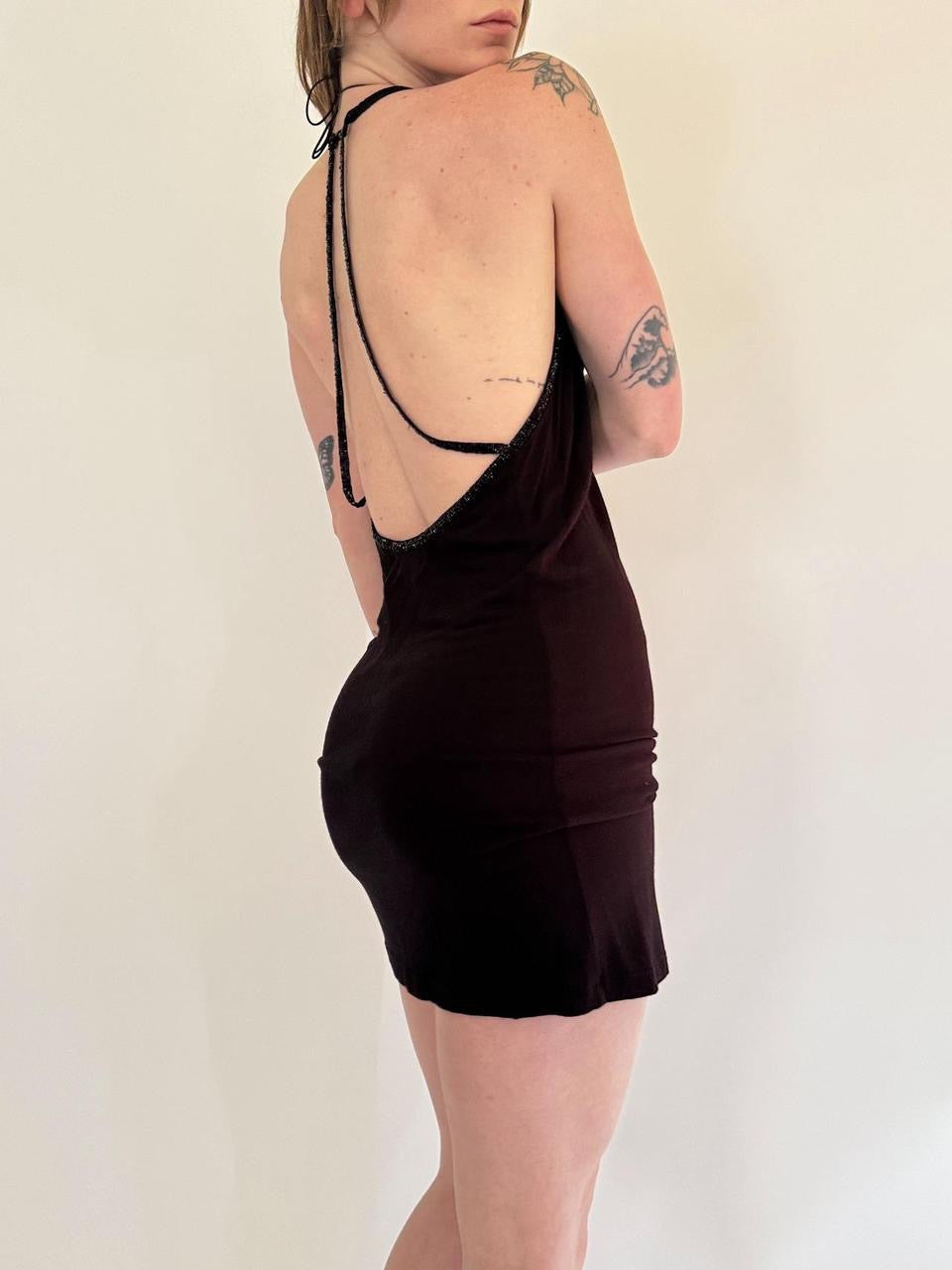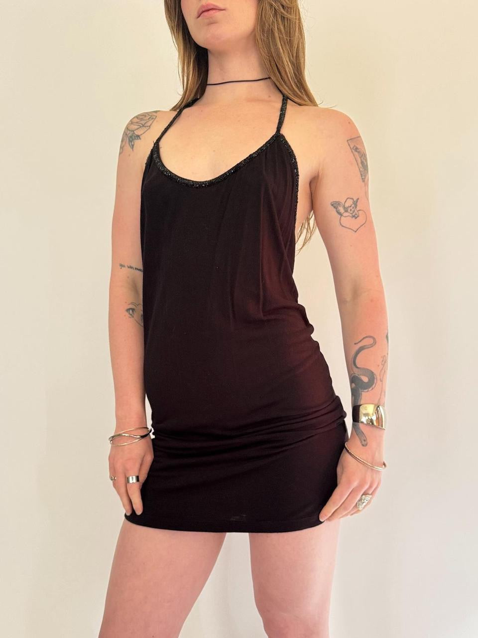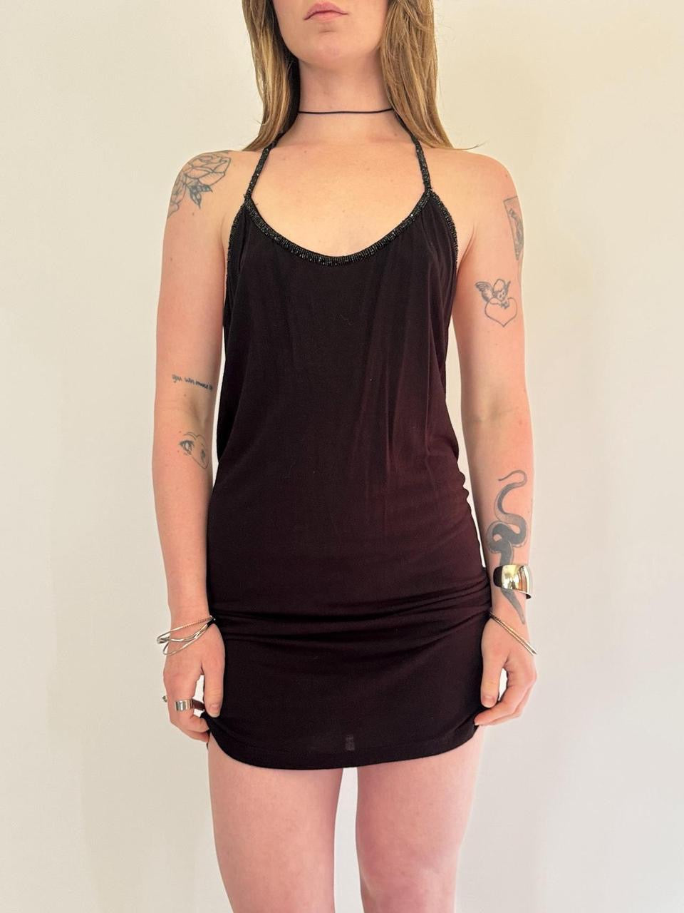 vintage “religion” black slouchy mini dress with black beaded slouchy straps.