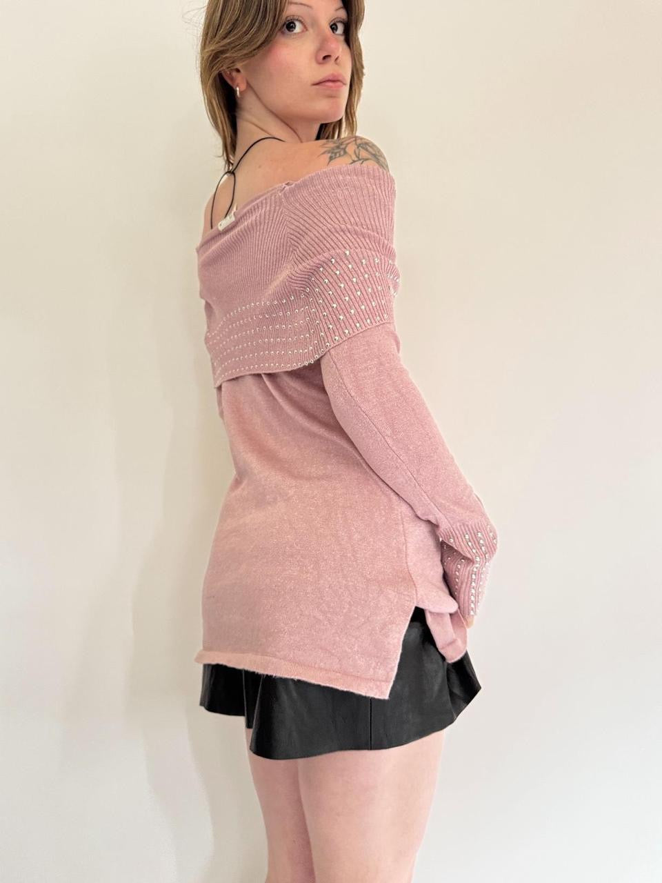 vintage 90s “questions?” pink shimmery long sleeve off the shoulder long sweater top / dress with studded details.